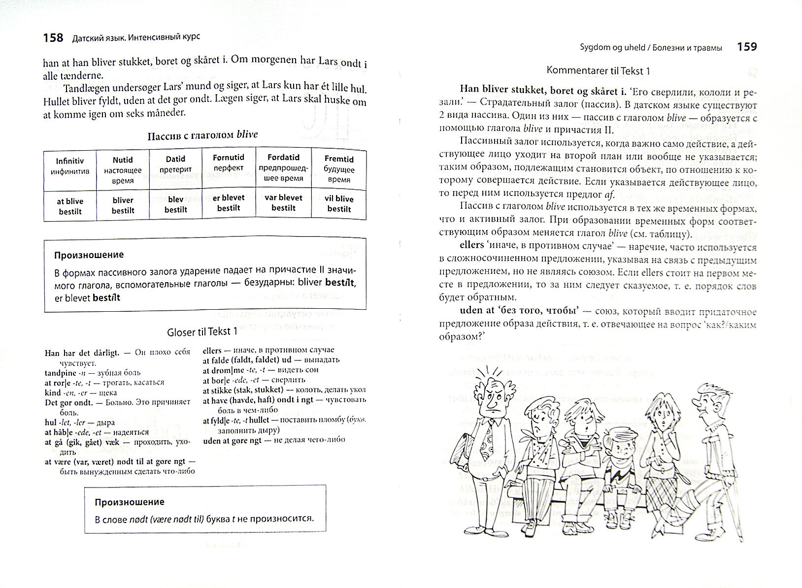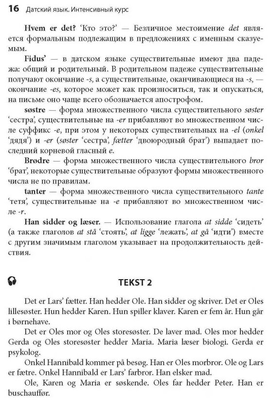 Учебник представляет собой вводный лексико-грамматический обучающий комплекс по датскому языку, задача которого — за короткий срок обеспечить усвоение значительного объема лексико-грамматической информации и получение навыков и компетенций, позволяющих перейти с нулевого уровня на уровень А2 по шкале общеевропейских компетенций владения иностранным языком. Учебник имеет четкую структуру. Он состоит из 16 уроков, разделенных по лексическим темам на 4 модуля. В каждом уроке представлены два текста, вводящих грамматические и лексические темы, и два диалога с речевыми формулами. За текстами и диалогами следует комментарий, объясняющий как новые языковые явления, так и культурологические реалии. Каждый урок включает в себя 10-12 послетекстовых упражнений, тренирующих новые темы и закрепляющих полученные навыки. В конце всех модулей дается лексико-грамматический тест. Проверить правильность выполнения упражнений можно при помощи ключей, которые находятся в конце учебника. Упражнения на аудирование, включенные во все уроки, важны для тренировки навыка понимания такого сложного для восприятия на слух языка, как датский.