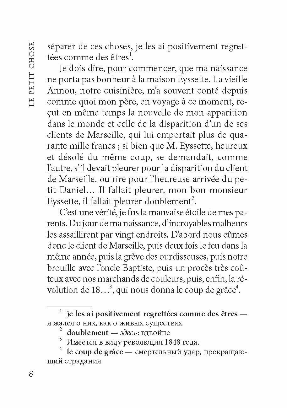 я нахожусь в самом начале изучения французского, поэтому книгу на оригинальном языке взяла скорее для того, чтобы отрабатывать правила чтения (связывание с артиклями, нечитаемые окончания), ну и быстроту чтения в том числе. беглого понимания не получается, но когда язык буду знать получше, смогу проверить себя еще раз. в книге нравиться, что она карманного размера, всегда можно взять с собой в дорогу и позаниматься иностранным языком