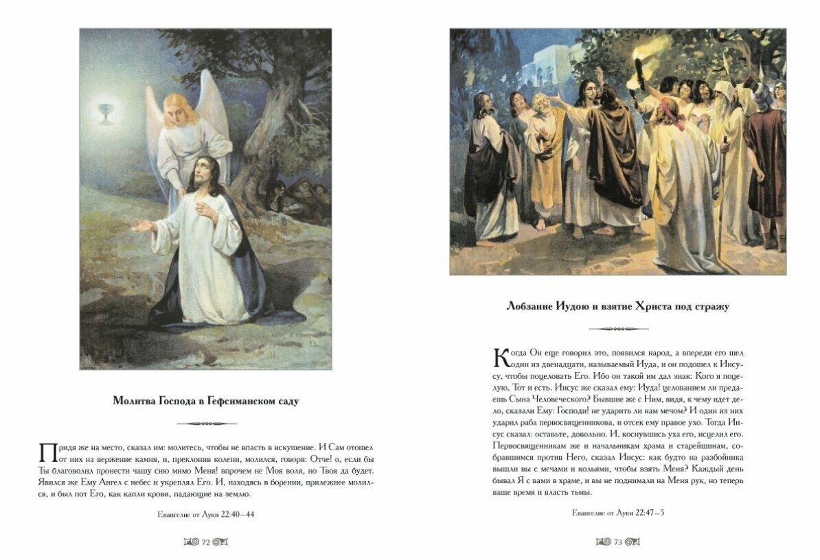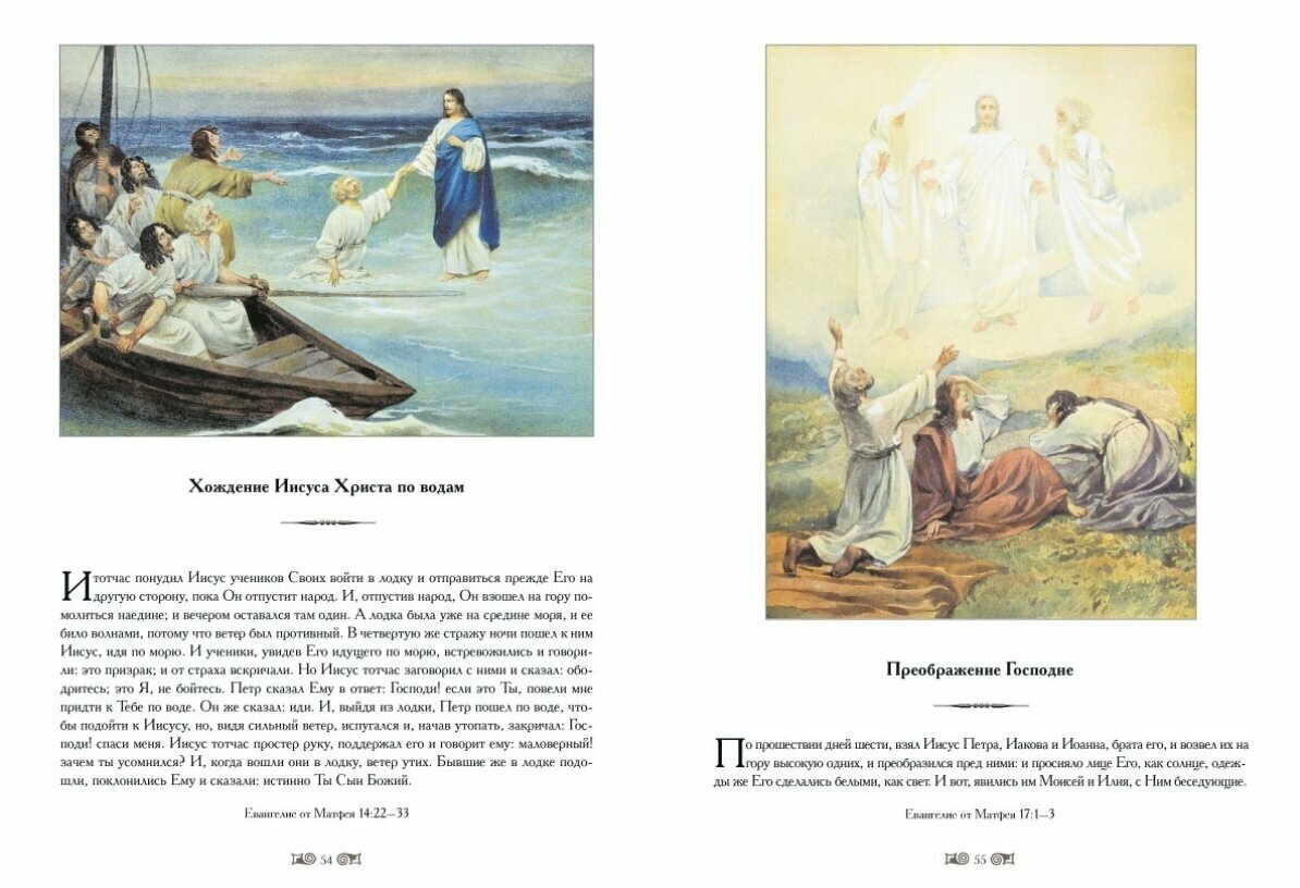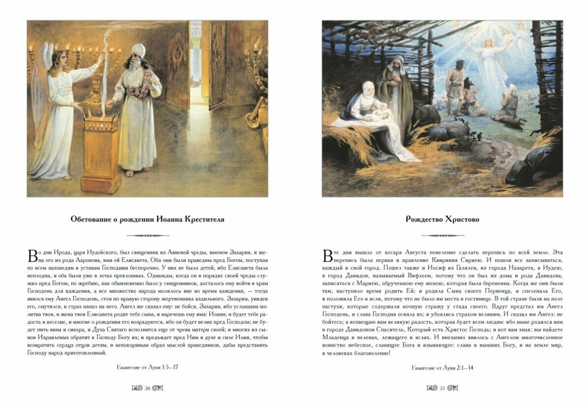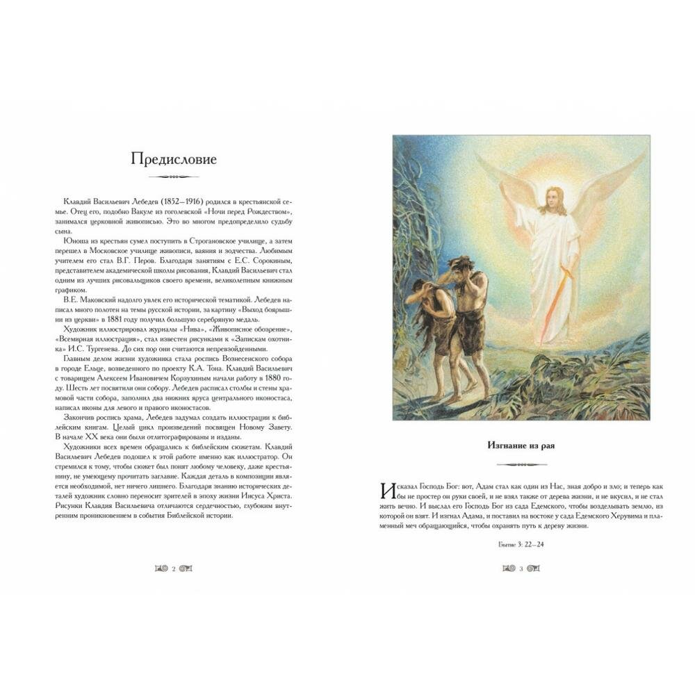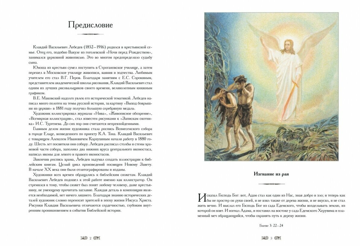 В книгу включены иллюстрации, сделанные известным русским художником К.В. Лебедевым к Новому Завету в конце XIX века. Цветные иллюстрации отражают все основные события, изложенные в Евангелии.