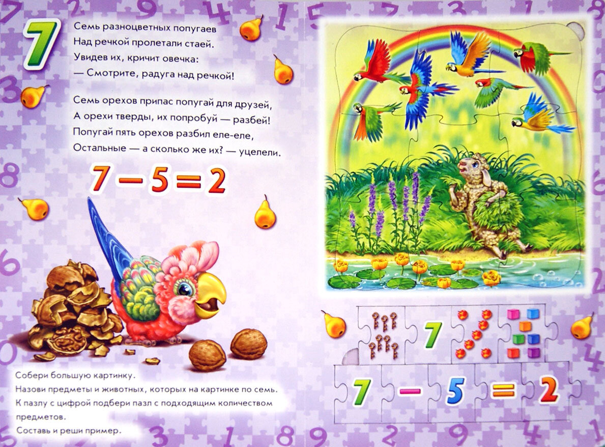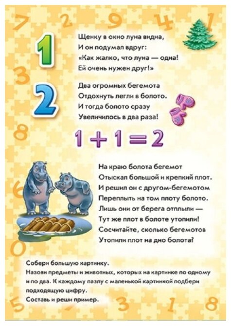 Играя с этой книжкой, ребёнок может: слушать стихи, собирать большие картинки-пазлы, подбирать цифру к картинке и картинку к цифре, составлять примеры и решать их!