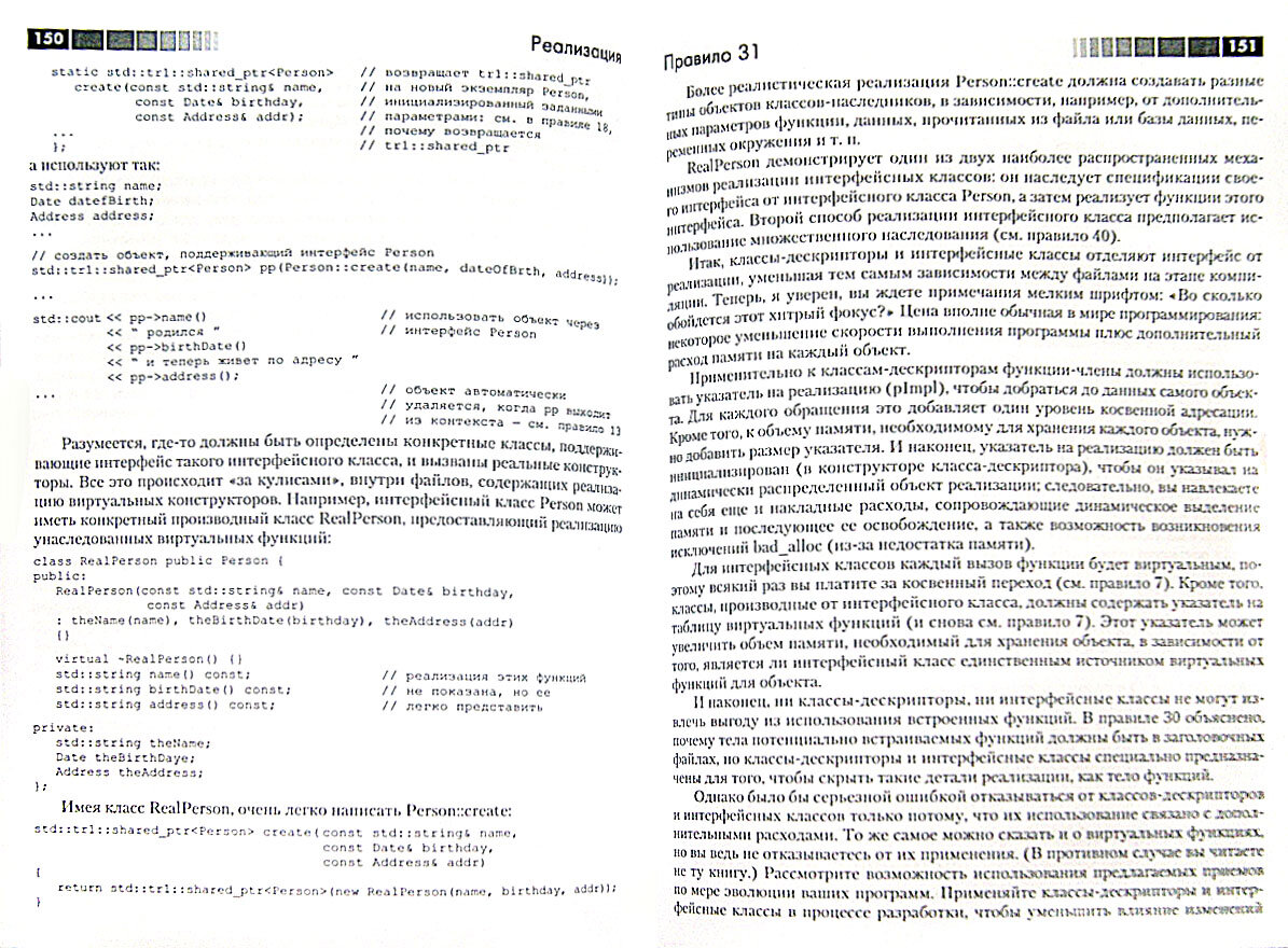 Эта книга представляет собой перевод третьего издания американского бестселлера Effective C++ и является руководством по грамотному использованию языка C++. Она поможет сделать ваши программы более понятными, простыми в сопровождении и эффективными. Помимо материала, описывающего общую стратегию проектирования, книга включает в себя главы по программированию с применением шаблонов и по управлению ресурсами, а также множество советов, которые позволят усовершенствовать ваши программы и сделать работу более интересной и творческой. Книга также включает новый материал по принципам обработки исключений, паттернам проектирования и библиотечным средствам.