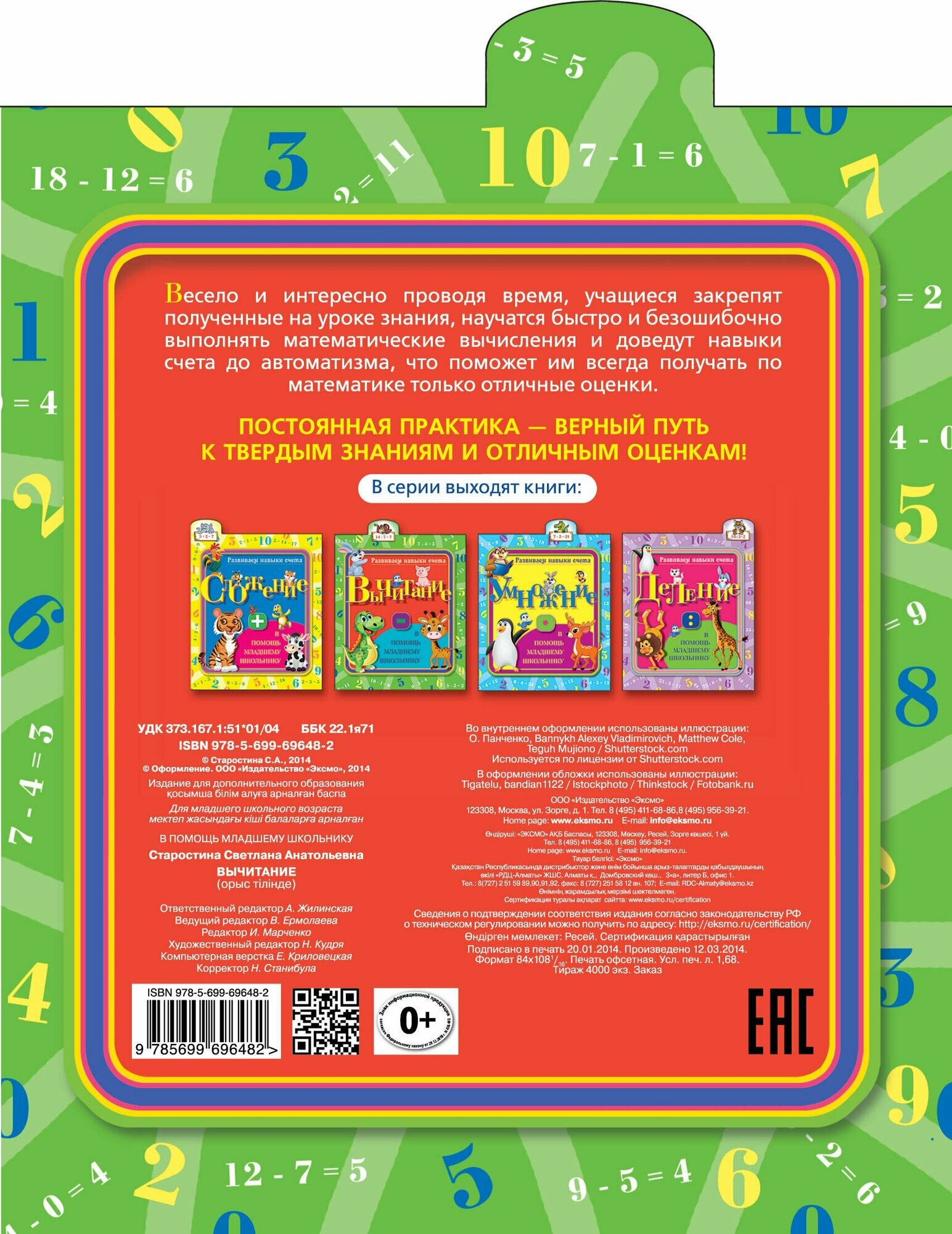 Решая примеры и выполняя занимательные задания, младшие школьники доведут вычислительные навыки вычитания до автоматизма и будут получать по математике только отличные оценки. Интересно проводя время, учащиеся закрепят знания, полученные на уроке, разовьют математическое и логическое мышление, повысят интеллектуальный уровень. Забавные цветные иллюстрации, вырубка с веселым героем сделают эту книгу заметной и выделят ее среди других книг.