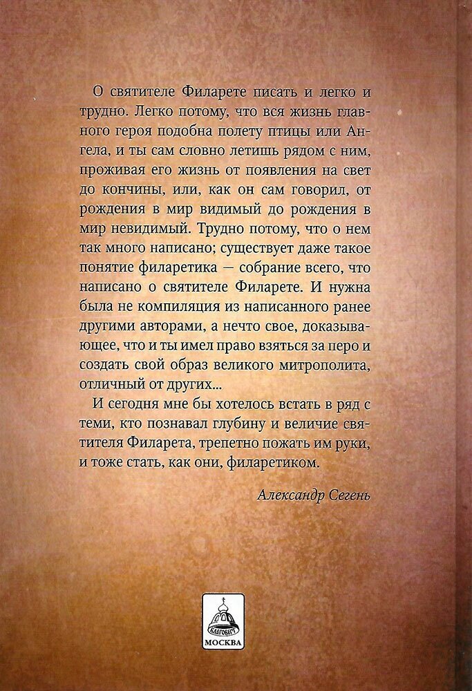 Эта книга повествует о жизни и свершениях митрополита Московского и Коломенского Филарета (Дроздова) (1782-1867). Сорок шесть лет он возглавлял московскую кафедру и оказал огромное влияние на движение русской общественной мысли в сторону национальной самоидентификации. Главным трудом его жизни стал перевод Библии на современный русский язык; столь же главным было для него постоянное служение Богу, составление и чтение проповедей, благодаря которым современники нарекли его Московским Златоустом. Святитель Филарет участвовал в важнейших государственных делах, к нему за советом обращались государи и многие известные люди России; при нем возводились новые храмы и восстанавливались старые. Под его духовным руководством был построен храм Христа Спасителя в Москве.