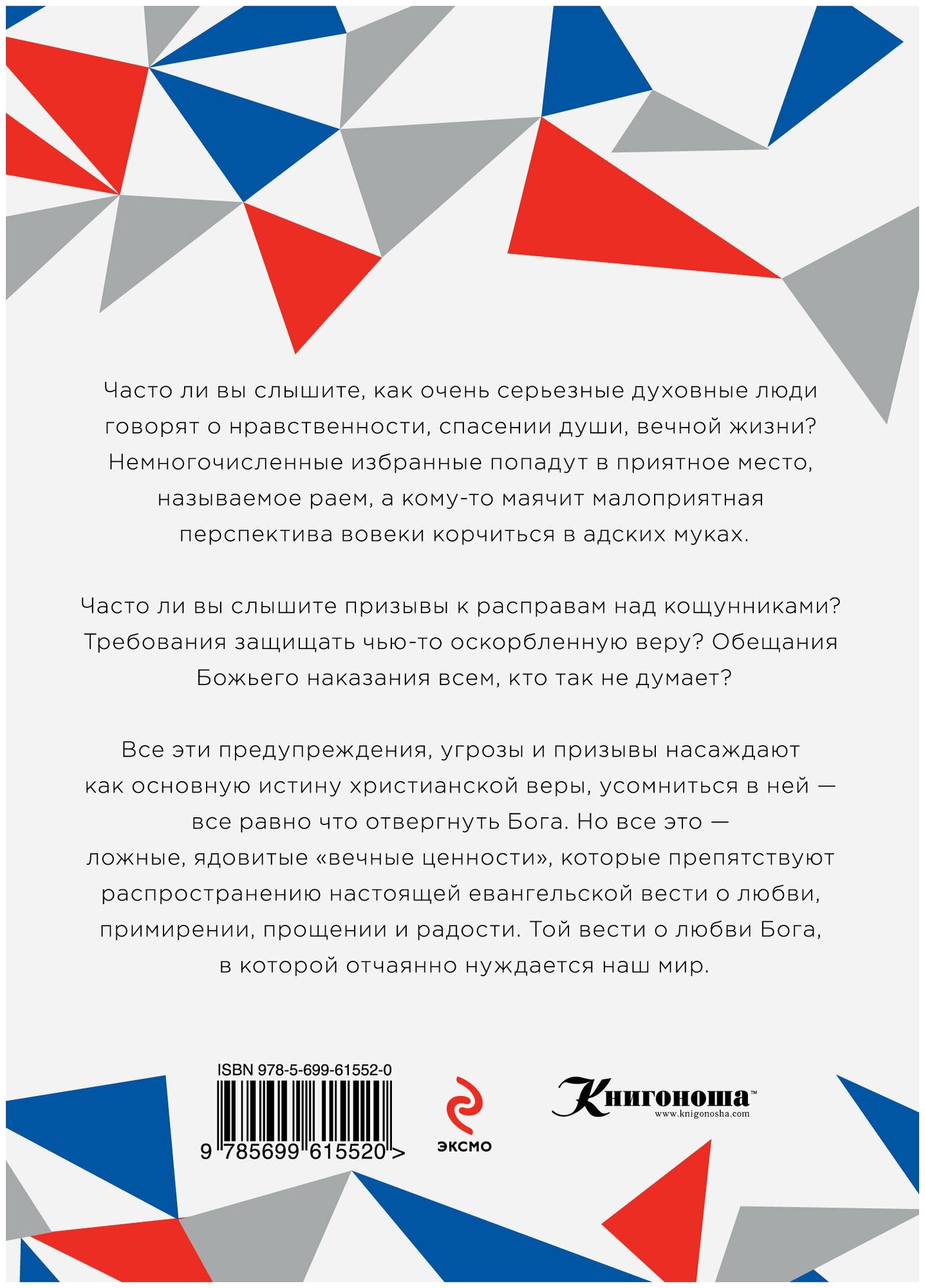 Самая смелая христианская книга, написанная в наше время. По силе влияния Роба Белла можно поставить в один ряд с Ником Вуйчичем. "Любовь побеждает" - это столь же мощный вызов и посыл к позитивной и осмысленной жизни, получивший горячий отклик миллионов сердец. Часто ли вы слышите, как очень серьезные духовные люди говорят о нравственности, спасении души, вечной жизни? Немногочисленные избранные попадут в приятное место, называемое раем, а кому-то маячит малоприятная перспектива вовеки корчиться в адских муках. Часто ли вы слышите призывы к расправам над кощунниками? Требования защищать чью-то оскорбленную веру? Обещания Божьего наказания всем, кто так не думает? Все эти предупреждения, угрозы и призывы насаждают как основную истину христианской веры, усомниться в ней - все равно, что отвергнуть Бога. Но все это - ложные, ядовитые "вечные ценности", которые препятствуют распространению настоящей евангельской вести о любви, примирении, прощении и радости. Той вести о любви Бога , в которой отчаянно нуждается наш мир. Еще до своего выхода книга Роба Белла стала сенсацией и расколола читающий мир на два многочисленных лагеря противников и сторонников автора.