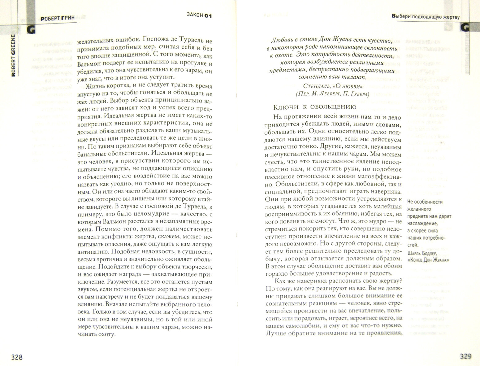 Книга в стиле Грина. Такой себе практикум по обольщению, используя различные исторические примеры, качества людей и черты характера. Книга подойдёт для думающего читателя. Думаю, что понравится карьеристам, маккиавелистам и, вообще, людям с высокими амбициями. Заставляет задуматься над некоторыми вещами, что само по себе всегда говорит в пользу той или иной книги. Качество печати добротное. Бумага хорошая. Изображений и иллюстраций тут уже хватает, так что я воздержусь. Ещё раз: рекомендую книгу для прочтения думающему читателю, хотя всё написано легко, и кому-то поможет расслабиться эмоционально и интеллектуально.