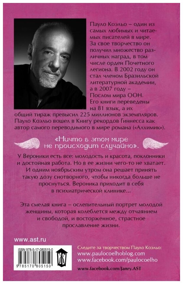 Узнав о своем диагнозе, Вероника решает прожить оставшееся ей время так, чтобы получить эмоций за всю прожитую жизнь. Как бы не звучало банально, но после прочтения книги, сразу начинаешь чувствовать вкус к жизни и всерьез задумываешься о мелочности своих повседневных проблем.