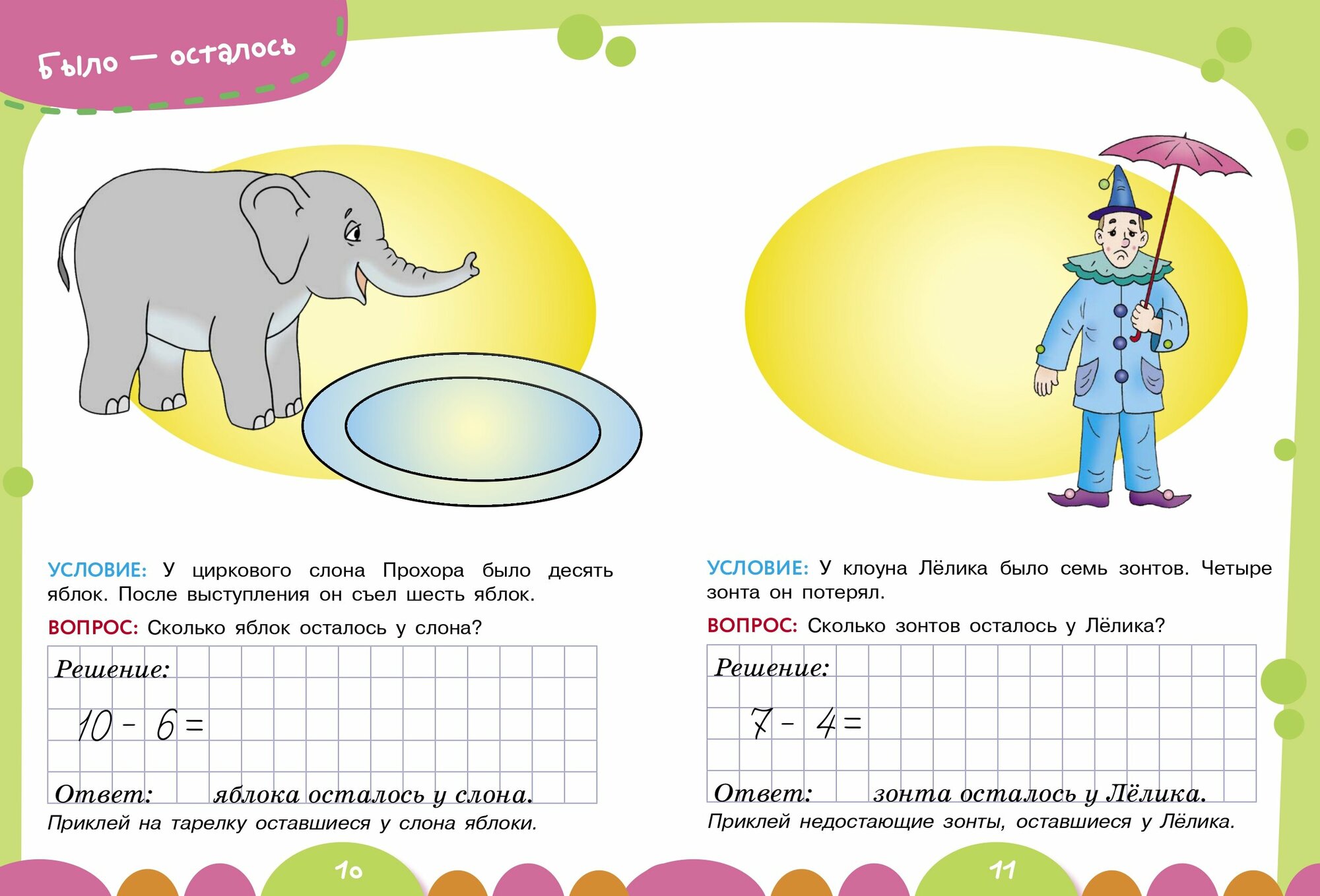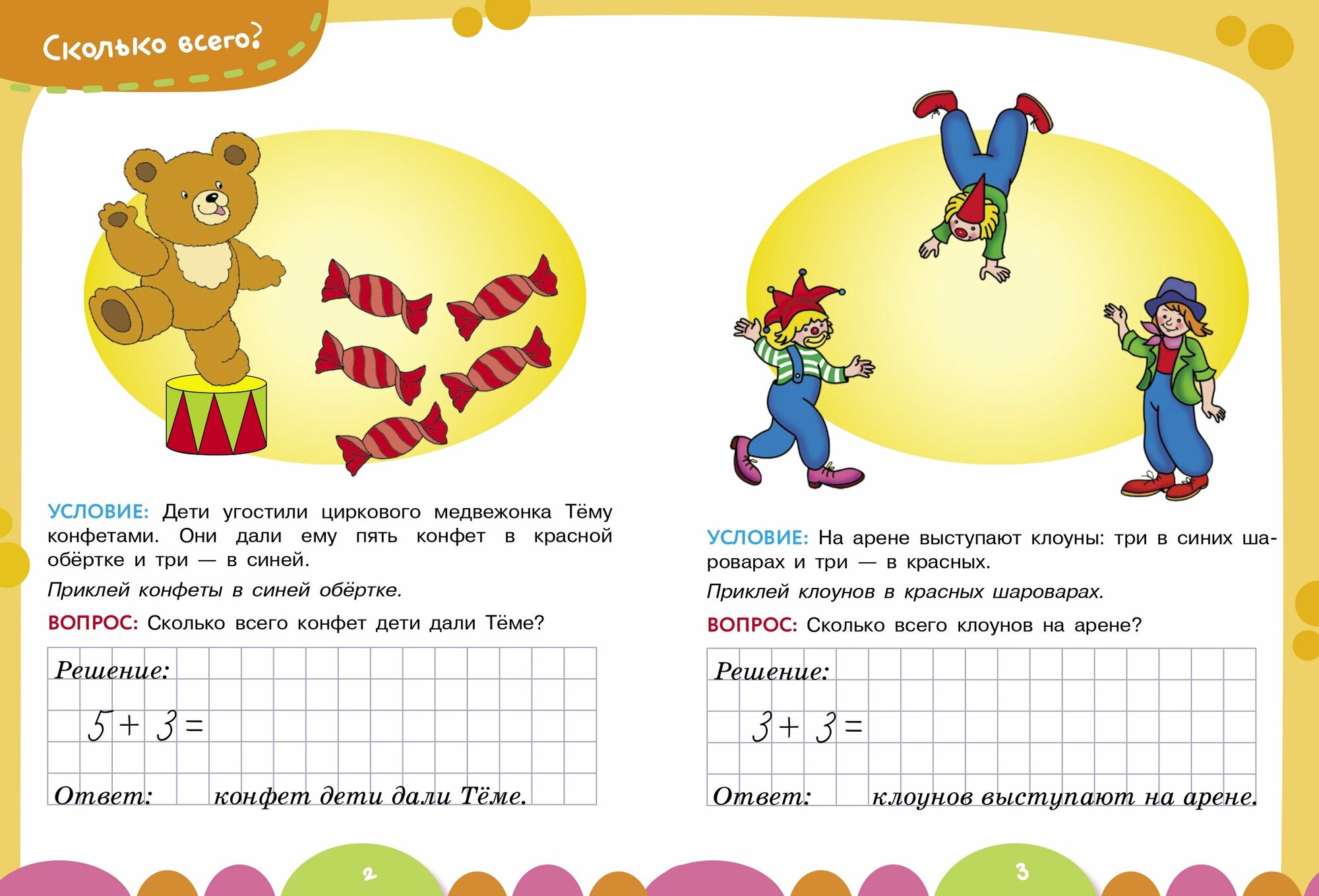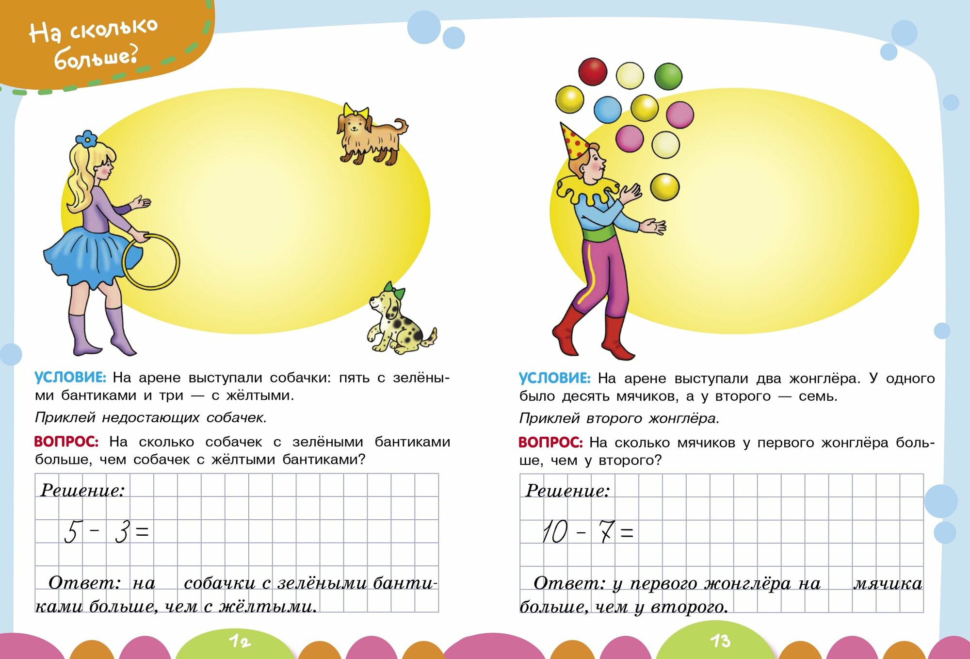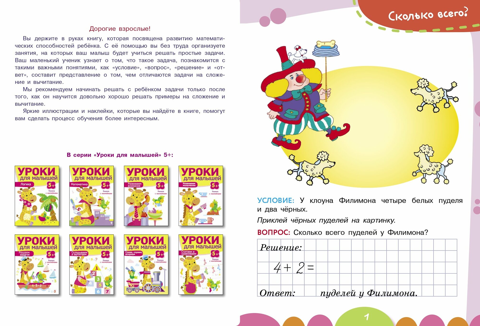 Вы держите в руках книгу, которая посвящена развитию математических способностей ребёнка. С её помощью вы без труда организуете занятия, на которых ваш малыш будет учиться решать простые задачи. Ваш маленький ученик узнает о том, что такое задача, познакомится с такими важными понятиями, как "условие", "вопрос", "решение" и "ответ", составит представление о том, чем отличаются задачи на сложение и вычитание. Мы рекомендуем начинать решать с ребёнком задачи только после того, как он научится довольно хорошо решать примеры на сложение и вычитание. Яркие иллюстрации и наклейки, которые вы найдёте в книге, помогут вам сделать процесс обучения более интересным.