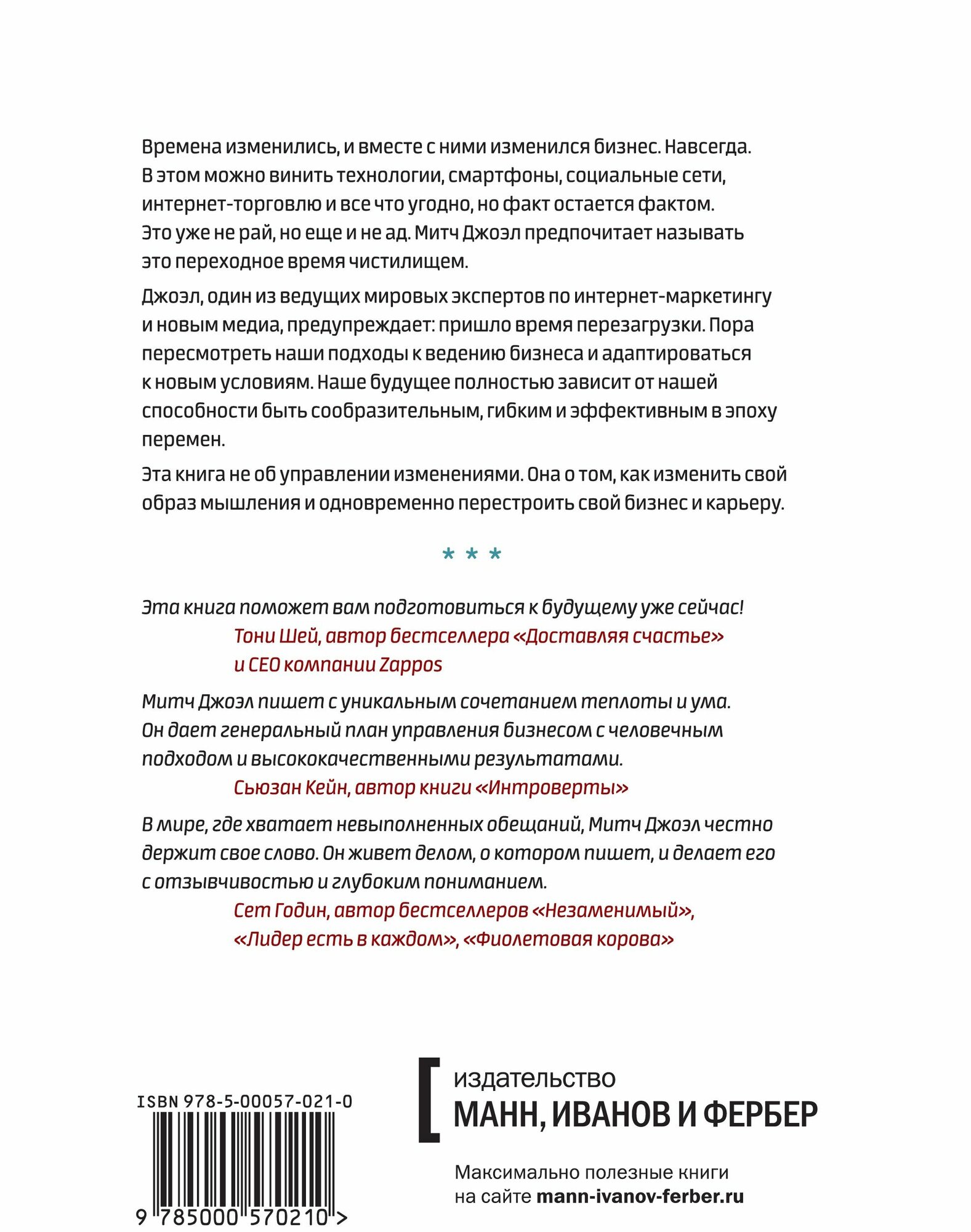 Наступило время серьезных перемен в бизнесе. Это уже не рай, но еще и не ад. Митч Джоэл предпочитает называть это переходное время чистилищем и предупреждает — многие отрасли и профессии могут исчезнуть, если не сделают перезагрузку. Пора пересмотреть наши подходы к ведению бизнеса и адаптироваться к новым условиям работы.