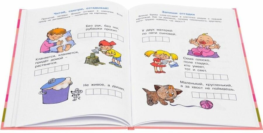 Эту книгу нужно купить обязательно! Она очень толково сделана. Во-первых, она очень веселая и многие задания в ней со "смешинками" - ребенку весело и увлекательно. Например, много заданий с "пропавшими буковками" (надо вставлять буквы в слова), много веселых путаниц - где надо применить и логику и знания простых слов.