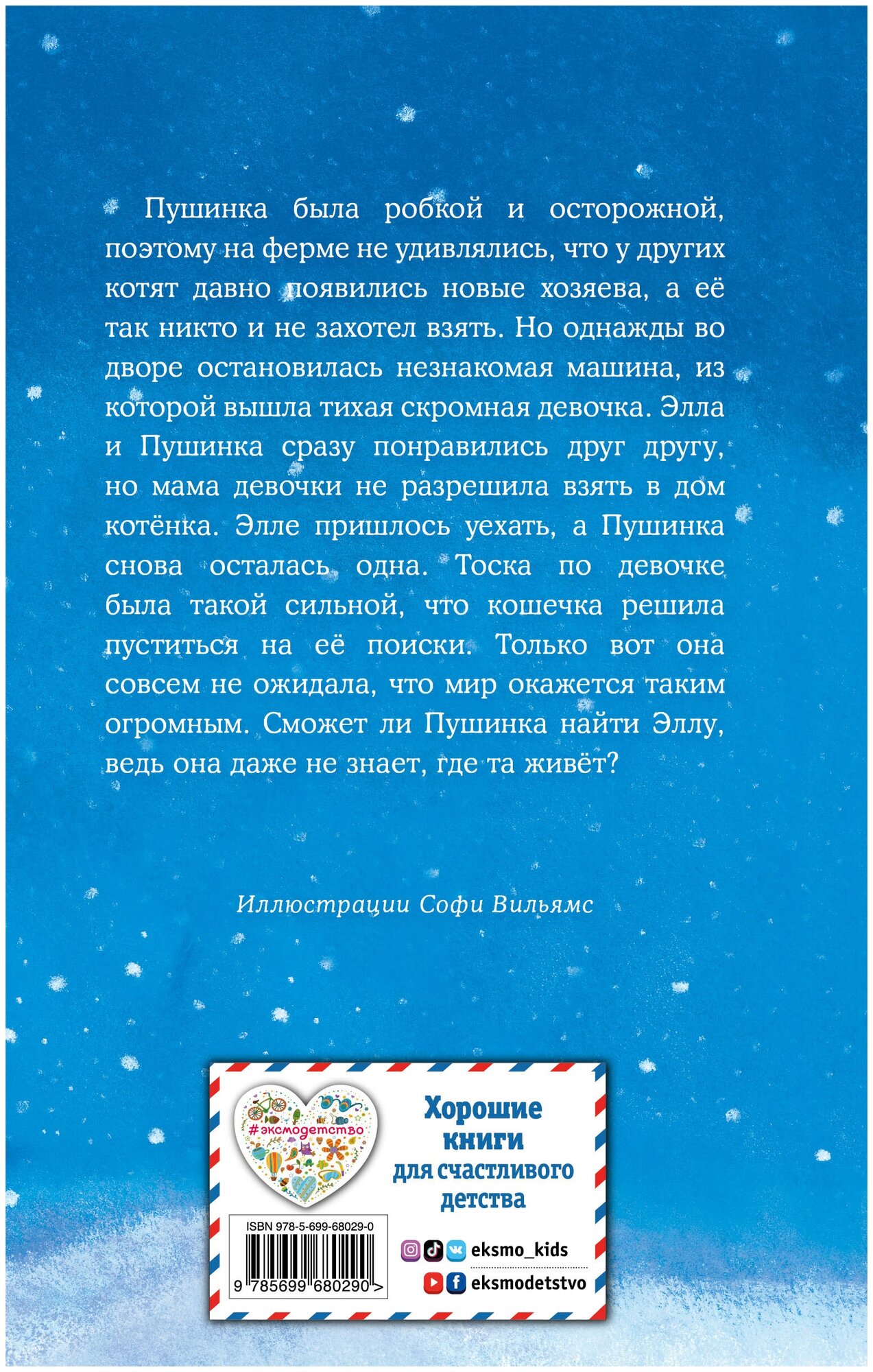 Пушинка была робкой и осторожной, поэтому на ферме не удивлялись, что у других котят давно появились новые хозяева, а её так никто не захотел взять. Но однажды во дворе остановилась незнакомая машина, из которой вышла тихая скромная девочка. Элла и Пушинка сразу понравились друг другу, но мама девочки не разрешила взять в дом котёнка. Элле пришлось уехать, а Пушинка снова осталась одна. Тоска по девочке была такой сильной, что кошечка решила пуститься на её поиски. Только вот она совсем не ожидала, что мир окажется таким огромным. Сможет ли Пушинка найти Эллу, ведь она даже не знает, где та живёт? Для младшего школьного возраста.