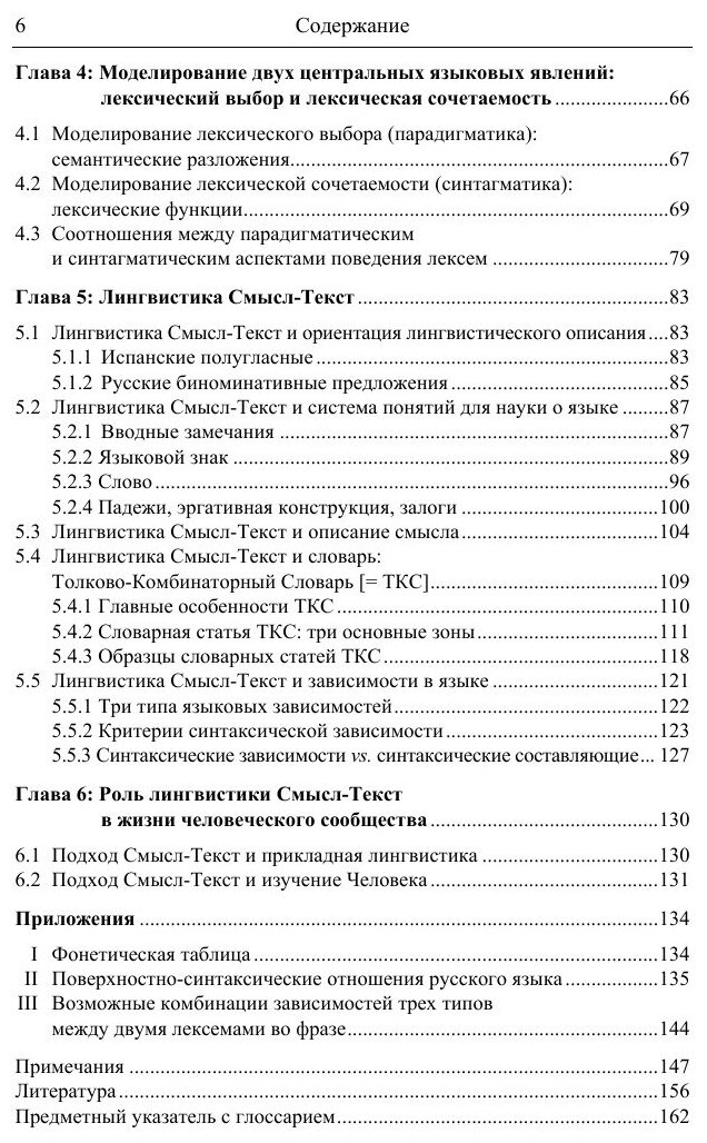 Книга содержит краткий очерк лингвистической теории Смысл-Текст с иллюстрациями, взятыми (в основном, но не только) из русского языка. В главе 1 излагаются три основные постулата подхода Смысл-Текст: естественный язык есть соответствие между смыслами и текстами; описание языка должно выполняться в виде его функциональной модели; описание языка должно быть стратифицировано: семантика (смысл) - синтаксис (фраза) - морфология (слово) - звук (фонология). В главе 2 разъясняется понятие функциональной модели применительно к естественным языкам. Затем (глава 3) предлагается сжатая характеристика одной конкретной модели Смысл-Текст с иллюстрациями из русского языка: обзор всех языковых представлений на семантическом, синтаксическом и морфологическом уровнях и всех модулей языковой модели, связывающих эти представления. Глава 4 посвящена двум важным проблемам подхода Смысл-Текст: семантическим разложениям и ограниченной лексической сочетаемости (= лексическим функциям); особо рассматривается соотношение между семантическими компонентами в толковании лексемы и значениями ее лексических функций. Глава 5 трактует пять избранных проблем, характеризующих подход Смысл-Текст: 1) направление описания должно быть от смысла к тексту (на примере испанских полугласных и русских биноминативных конструкций); 2) система понятий и терминов для лингвистики (языковой знак и операция языкового объединения; понятие слова; падеж, залог и эргативная конструкция); 3) формальное описание смысла (строгое развертывание семантем; стандартизация семантем; адекватность разложения; принцип максимального блока); 4) Толково-Комбинаторный словарь (с образцами полных словарных статей); 5) зависимости в языке, в особенности - синтаксические зависимости (формулируются критерии установления синтаксических зависимостей во фразе). В главе 6 кратко характеризуется возможная роль лингвистики Смысл-Текст в жизни человеческого сообщества. В приложении дается список поверхностно-синтаксических отношений русского языка. Имеется предметно-тематический указатель с глоссарием, где приводятся короткие определения используемых понятий.
