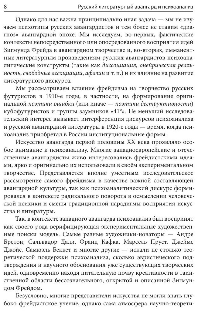В книге рассматриваются историко-литературные и теоретические контексты влияния психоаналитических идей на развитие русского авангарда первой трети ХХ века. Приводятся свидетельства вполне осознанной авангардистами рецепции идей З. Фрейда и их применения в формировании авангардной теории.