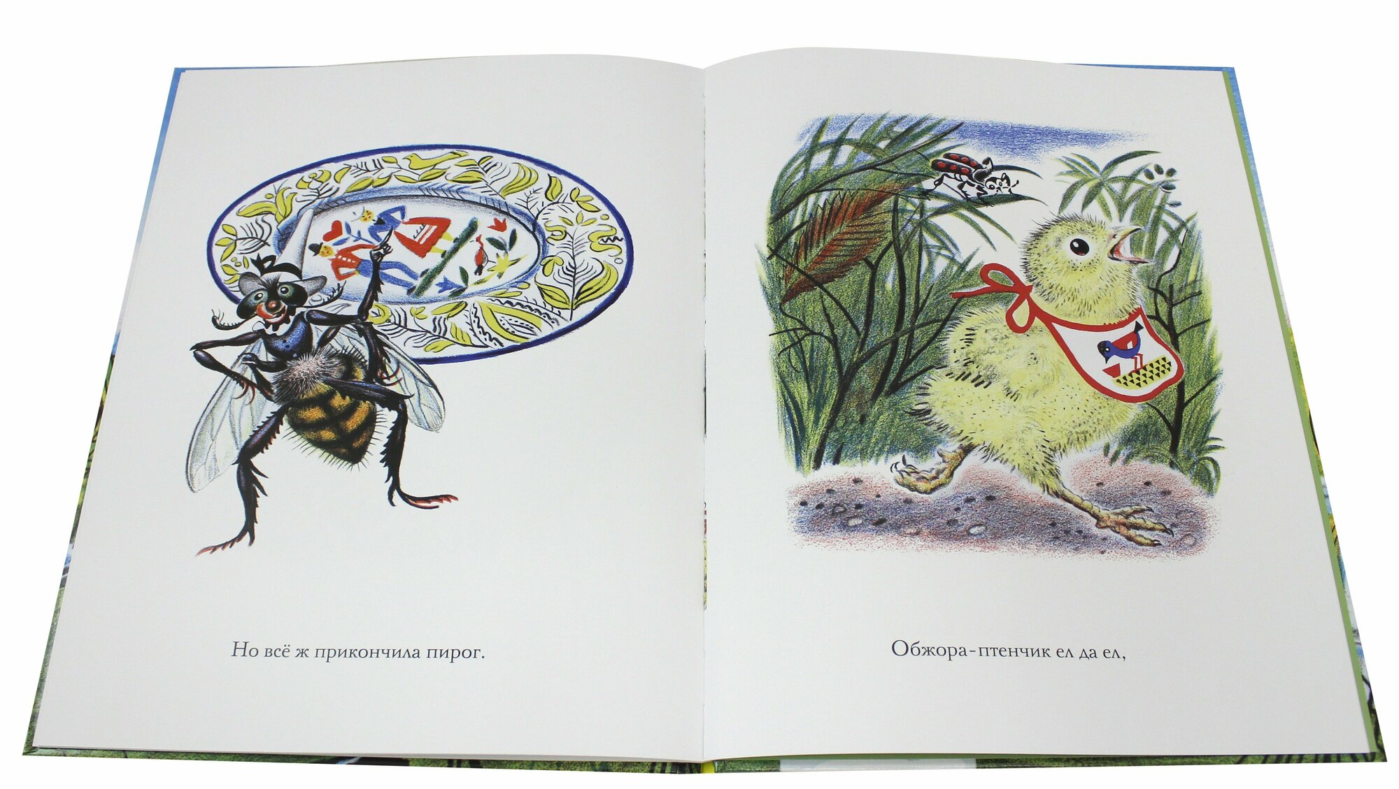 Вот бравый лягух - Mr. Frog, как написано на почтовом ящике возле его избушки, надевает начищенные до блеска сапоги со шпорам и вскакивает на коня, чтобы тотчас же помчаться на свидание к мышке. Коня явно застали врасплох – он несколько ошеломлён таким неожиданным напором. Мышка-невеста сидит за прялкой в совершенно дивном домике в стволе дуба. Художник изобразил и почтовый ящик с красным флажком и надписью «Miss Mouse» и очаровательный балкончик-гриб. А какие замечательные насекомые получились у Фёдора Степановича – одна только блоха-балерина в пуантах чего стоит! Натуралистичные, удивительно лёгкие и живые рисунки, которые хочется долго разглядывать вместе с малышом.