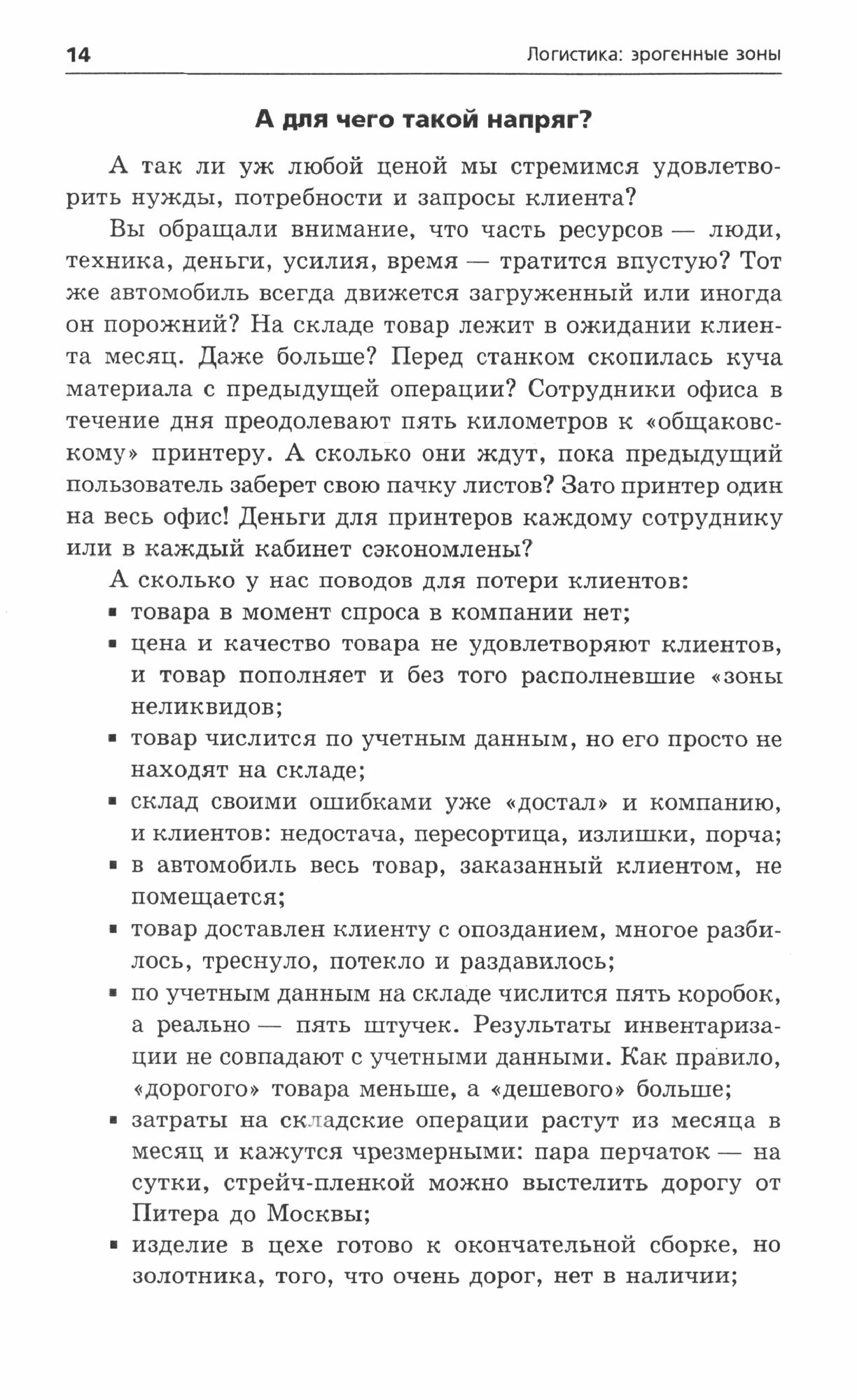 Главная задача этой книги - помочь руководителям компаний и отделов наиболее эффективно управлять своим бизнесом с помощью так называемых "эрогенных зон" логистики. Логистика - стержень, пронизывающий все сферы деятельности компании. Оптимизируя стержень, воздействие автоматически распространится и на все остальные структуры компании. Когда все технологии исчерпали себя, на выручку приходит логистика. Сквозное управление движением материального потока дает результаты, которые не под силу другим областям менеджмента: снижаются уровни всех видов запасов, "размораживаются" миллионные средства, товар гораздо быстрее поступает к потребителю, растет уровень сервисного обслуживания клиента. В итоге - снижение затрат, повышение конкурентоспособности компании, увеличение прибыли компании и, конечно же, рост личного благосостояния тех, кто привел компанию к этим победам. Итак, ищем "эрогенные зоны" и грамотно воздействуем.