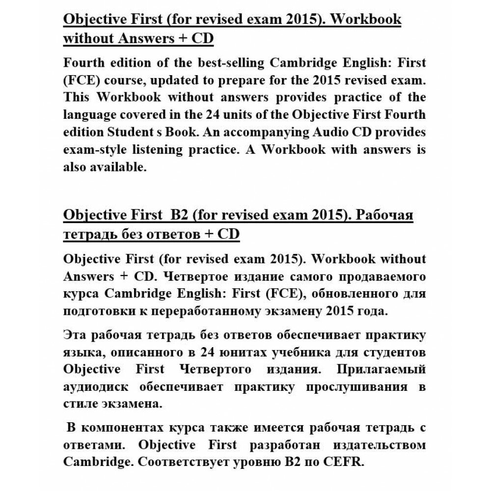 На сегодняшний день товар «Книга: Objective First 4 Edition Workbook without answers +СD (Capel Annette; Sharp Wendy); Cambridge, 2014» можно купить с кешбеком в 1 магазине: Яндекс.Маркет
