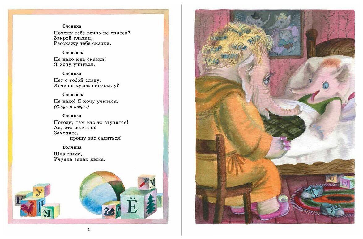 Пьеса-сказка в стихах "Слонёнок пошёл учиться" - прекрасный повод для родителей познакомить малышей с драматическим жанром. Она объединила усилия двух необыкновенно талантливых людей: ритмичные музыкальные стихи Давида Самуиловича Самойлова дополнены забавными картинками художника-иллюстратора Владимира Исааковича Винокура.