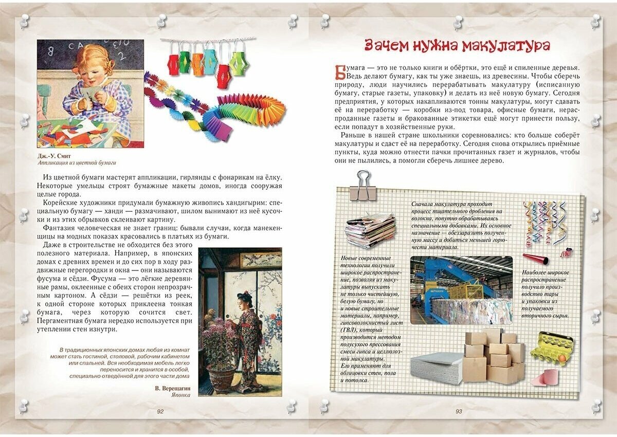 Отличное оформление книги - крупный шрифт, много ярких картинок, по формату она чуть больше чем А 4, но не тяжелая, страниц не так уж и много, а главное- безумно интересно было читать не только ребенку, но и мне! Оказывается, мы ничего не знали даже про элементарную бумагу. Полезная информация дается очень доступным языком! мы довольны на все 100%!