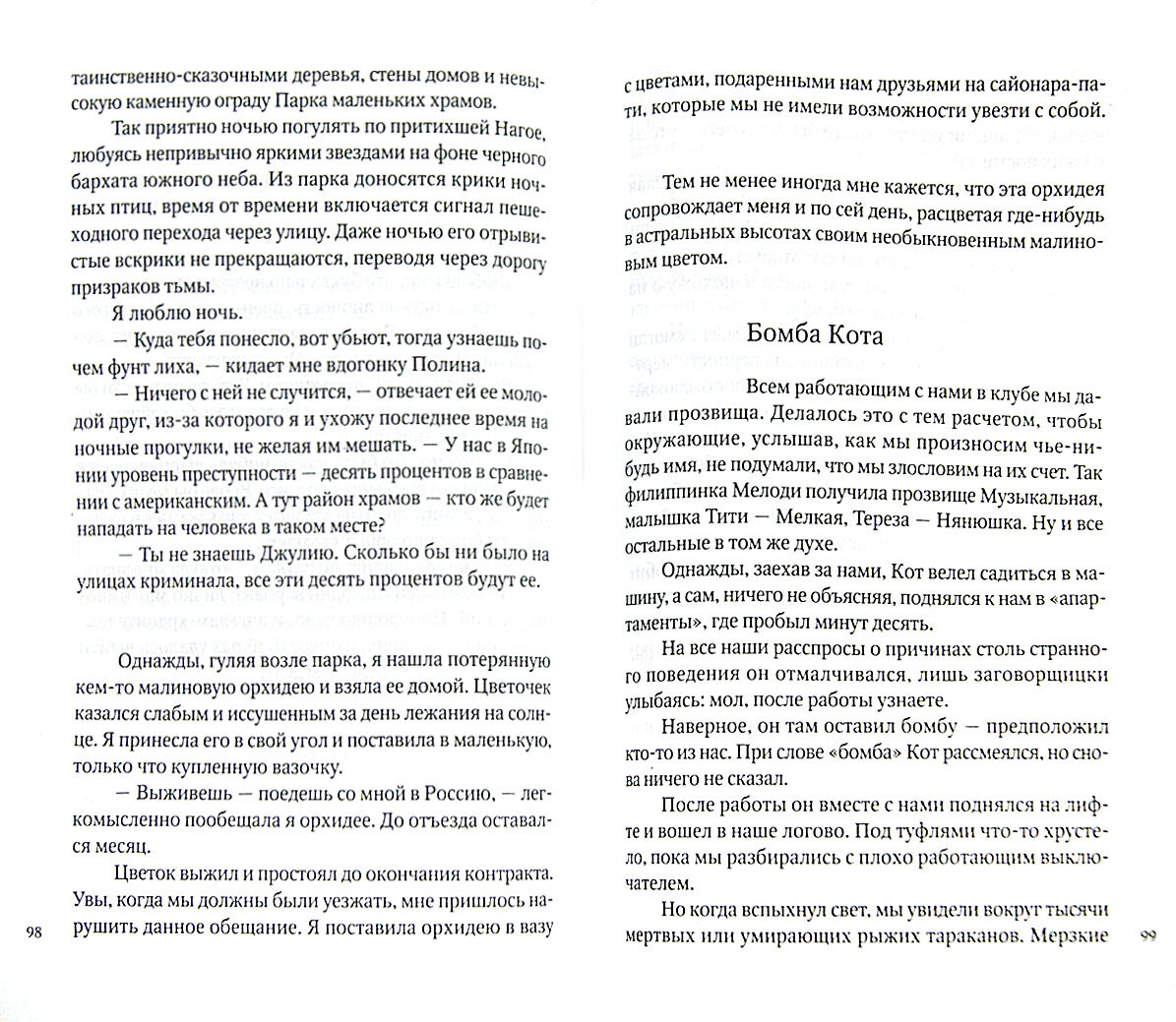 Читателей ждет искренний и остроумный рассказ о консумации, японских тараканах, и в буквальном, и в переносном смысле; о клубах Японии; о землетрясениях; о любви японцев к совместному употреблению горячительных напитков; о страшных якудза - пальцы веером, и многом, многом другом.