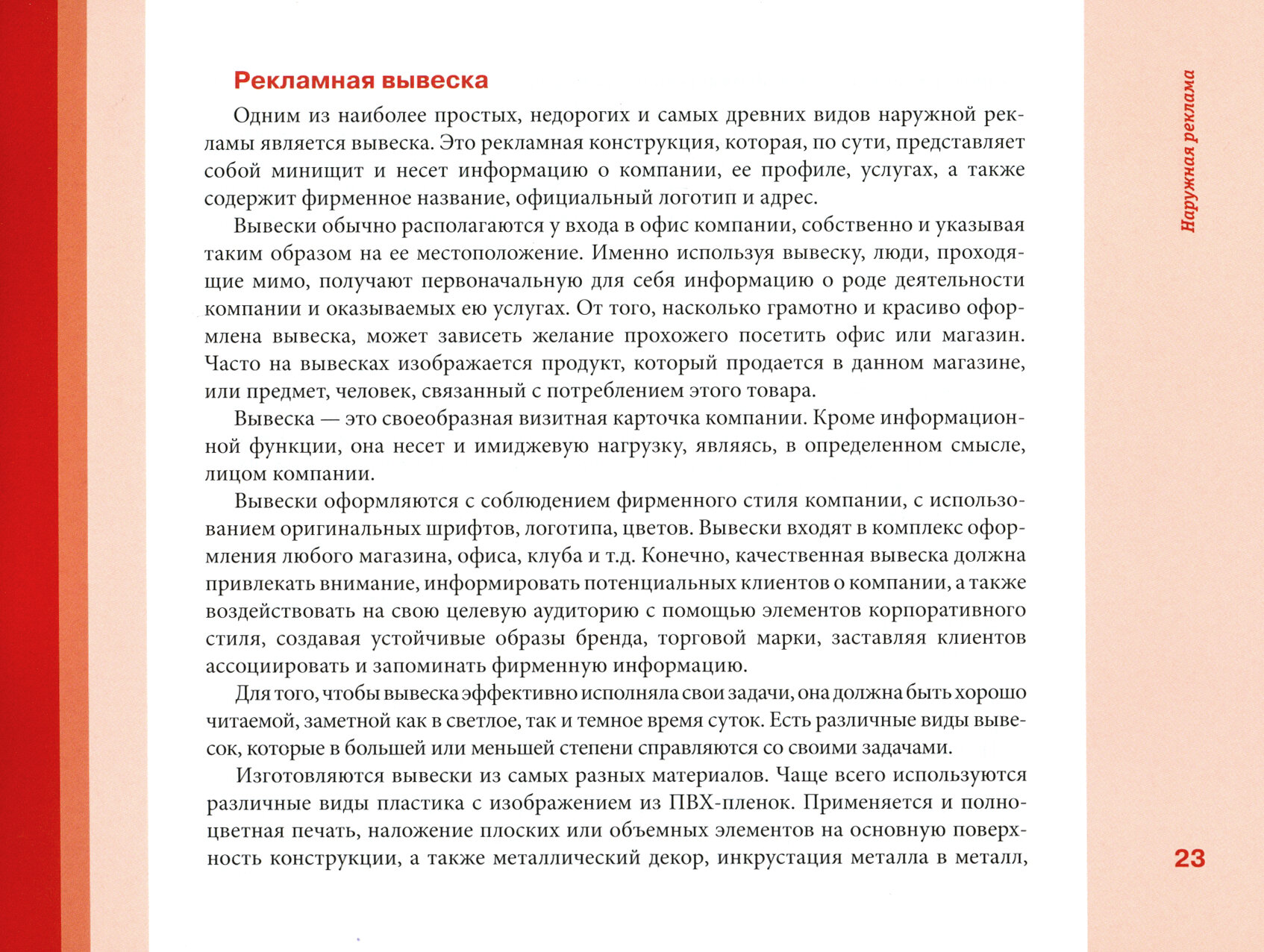 В книге рассматриваются различные аспекты современной наружной, внутренней и транзитной рекламы. Широко представлен обзор видов и конструкций рекламных сооружений, их достоинства, недостатки, стоимость, специфика изготовления и размещения. Особое внимание уделено медиапланированию, созданию текста и визуальному оформлению рекламных посланий именно для данного типа рекламоносителей.