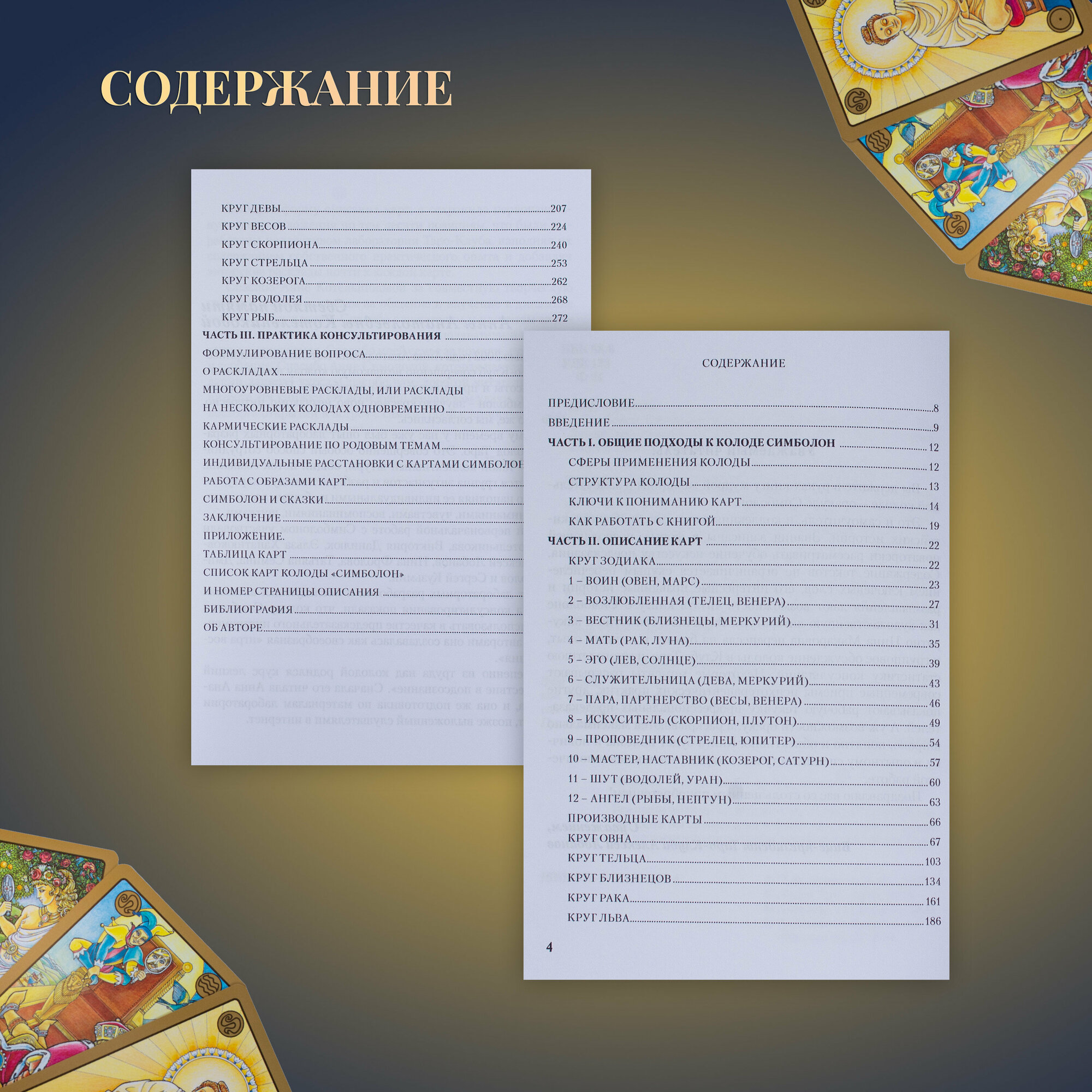 В 1 части книге есть описание сфер применения колоды, структуры колоды, ключи к пониманию карт, как работать с самой книгой.