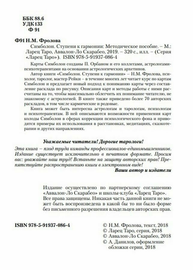 Автор книги "Симболон. Ступени к гармонии" - Н.М. Фролова, психолог, таролог, мастер Рейки - в течение многих лет читает курс по картам Симболон и предлагает новый подход к пониманию карты через составление расклада по рисунку. Описания карт и методы работы с ними рассчитаны на то, чтобы максимально облегчить их понимание читателю, не знакомому с астрологией. В книге также приведено более 70 авторских раскладов, в том числе кармические и родовые.