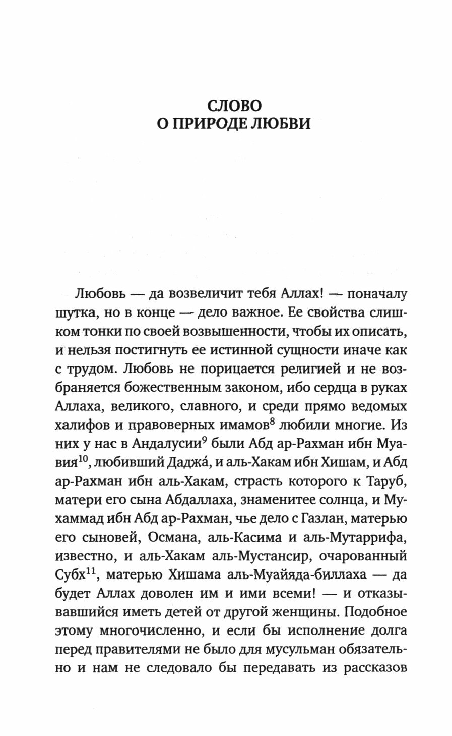 Эта книга позволяет совершить небольшое путешествие во времени, перенося нас в жизненный мир героев "1000 и 1 ночи", в мавританскую Испанию на 1000 лет назад. Автор "Ожерелья голубки" - современник Владимира Красное Солнышко и Ярослава Мудрого,Эдуарда Исповедника и Мурасаки Сикибу. Выросший в мавританском гареме, Али ибн Хазм с детства пытался постигнуть природу любви. Этот трактат - ничтожный осколок его научного творчества, включавшего 400 произведений - был написан по заказу друга и стал промежуточным итогом жизненного пути вельможи и философа XI века. Чаще всего, вспоминая об этом произведении ибн Хазма, говорят о том, что он считал любовь болезнью, от которой не жаждут избавления. Это так, но это лишь одна из многочисленных метафор, которыми пестрит эта книга. С тонким психологизмом и прекрасными стихами собственного сочинения ибн Хазм показывает любовь столь же многоликую и разнообразную, как и сказки Шахерезады.