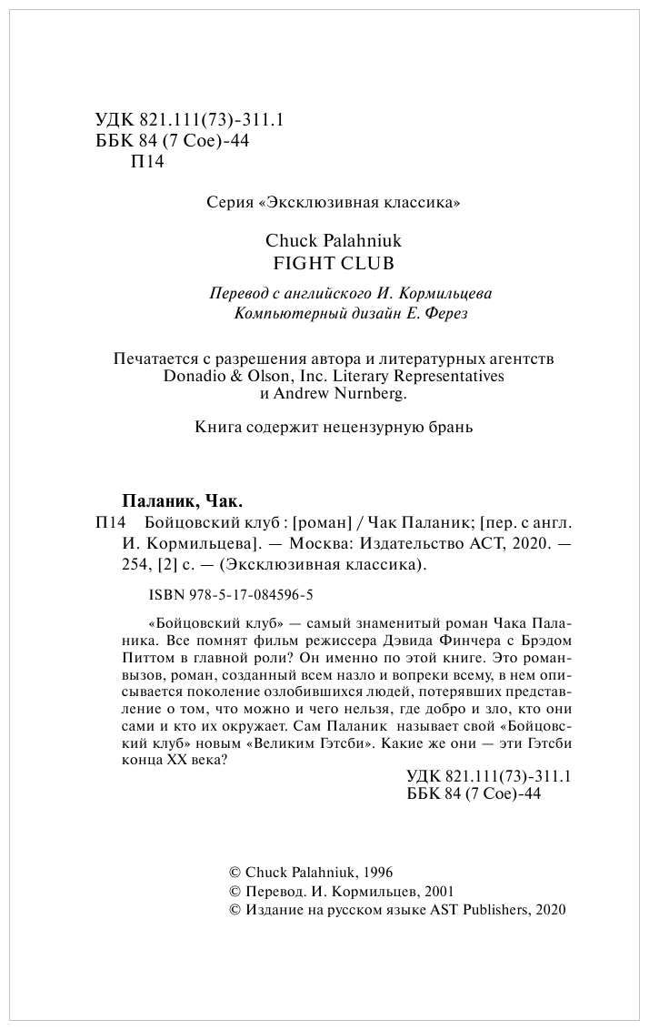 Книга: Бойцовский клуб (Чак Паланик); АСТ, 2020