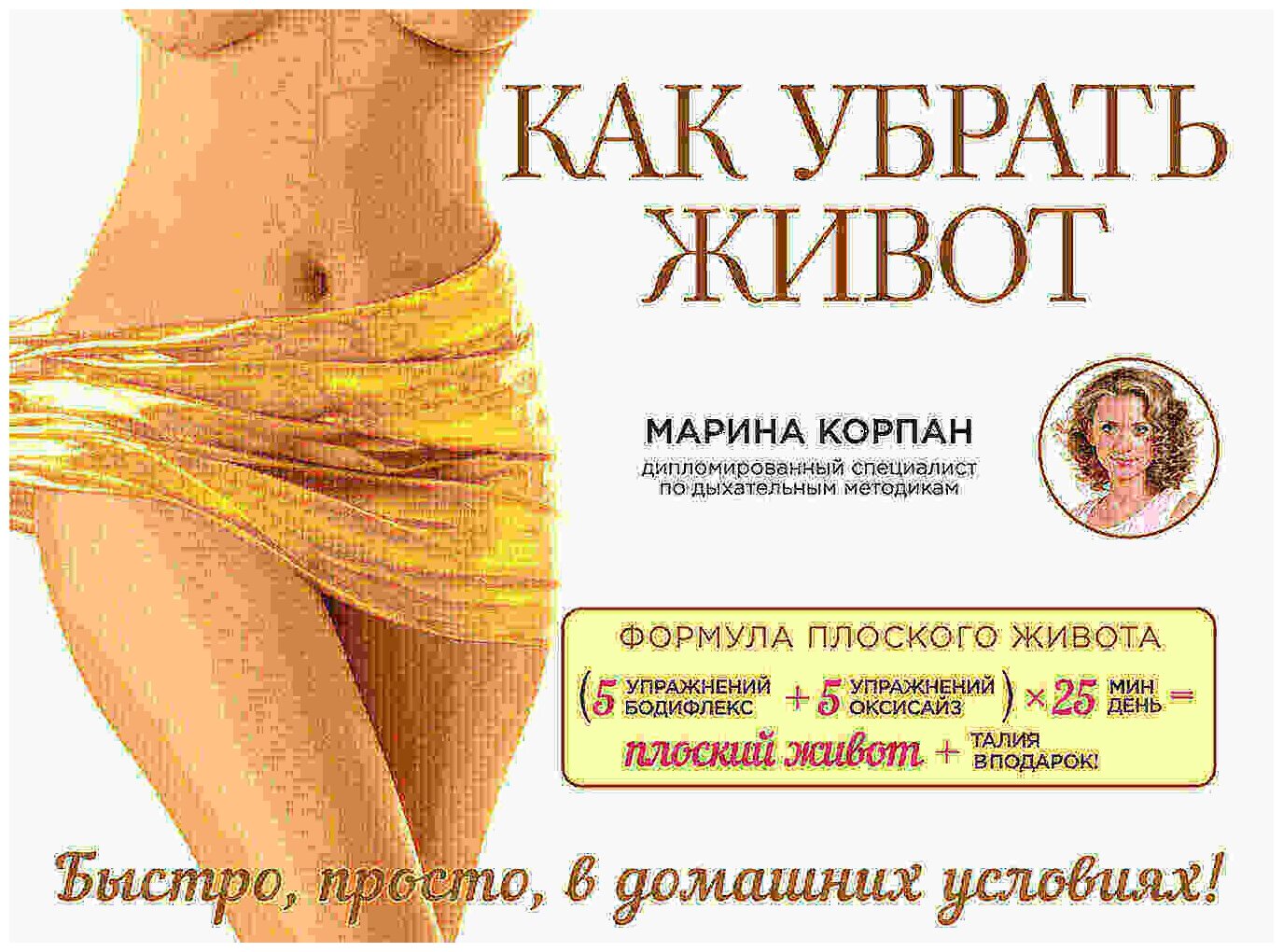 Нашла эту книгу в Новом Книжном! Она еще лучше, чем на картинке! Слежу за новинками по этой теме, и Как убрать живот Марины Корпан - самая лучшая! Начинаю прямо сегодня упражнения. Ну завтра, надо ведь с утра! Всего 5 упражнений! Бодифлекс немного знаю, надо будет только повторить, но и Оксисайз подробно описан. Фото и рисунки нравятся: на модели как бы надета маечка, на которой принт с работающей мышцей в этом упражнении. Верю, что смогу! В конце июля - в отпуск с плоским животом!