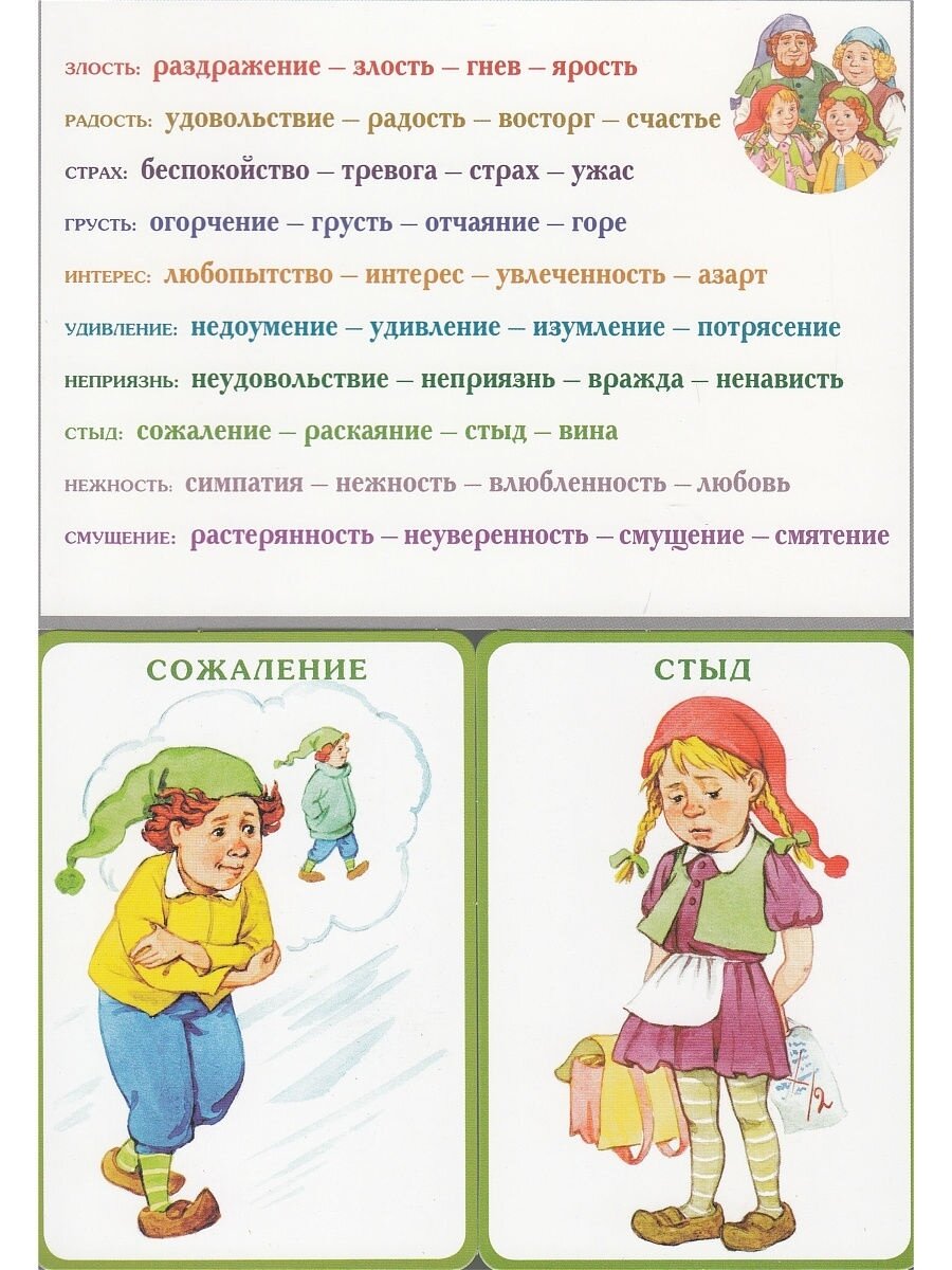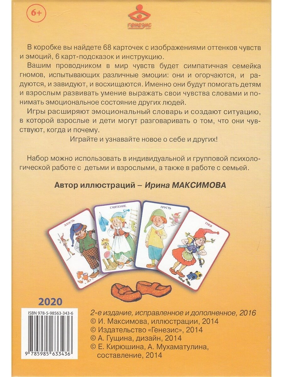 В набор игр для развития эмоциональной сферы входят карточки с изображениями основных чувств и эмоций и их оттенков (68 карточек), а также инструкция и 6 карт-подсказок. Иллюстрирует эмоции симпатичная семейка гномов: они и огорчаются, и радуются, и завидуют, и восхищаются. Игру можно использовать в индивидуальной и групповой психологической работе с детьми и взрослыми, а также в работе с семьей. В инструкции приводятся основные идеи и правила игр, в ходе которых дети и взрослые могут развивать умение выражать свои чувства словами и понимать эмоциональное состояние других людей. Игра расширяет эмоциональный словарь и создает ситуацию, в которой взрослые и дети могут разговаривать о том, что они чувствуют, когда и почему. Согласитесь - подобные ситуации сами по себе возникают в нашей жизни не так уж часто! Игру можно использовать в индивидуальной и групповой психологической работе с детьми и взрослыми, а также в работе с семьей. Составление: Е. Кирюшина, А. Мухаматулина. В набор входят: 40 карт с линейками эмоций. 20 дополнительных карт с одиночными эмоциями (10 парных эмоций) 8 портретных карт с изображением всей семейки 6 карточек-подсказок Инструкция