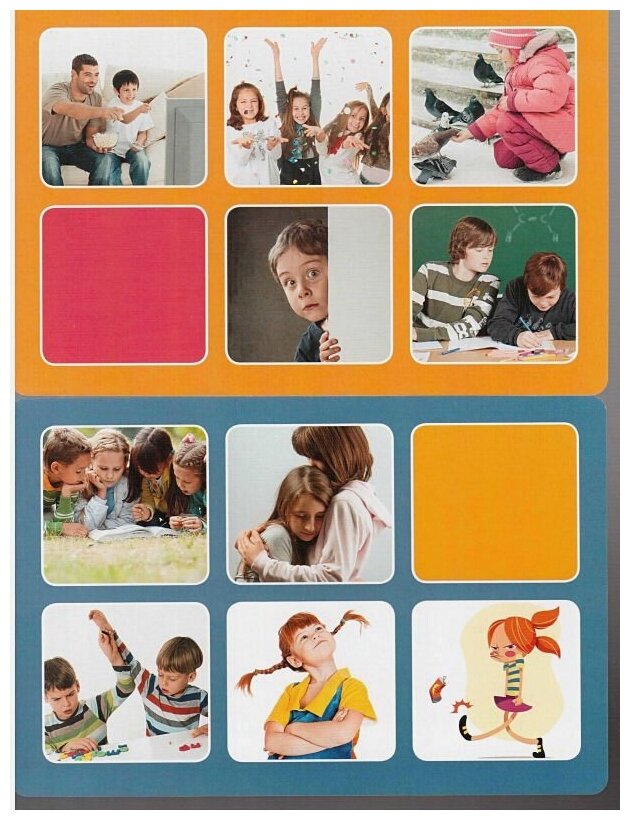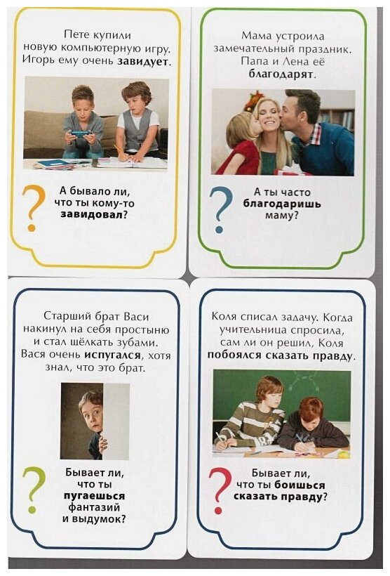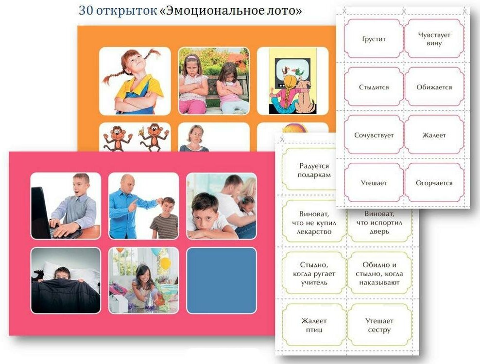 одна с карточками, где описаны ситуации, в которых кто-то испытывает определенные эмоции, и с вопросом, в каких ситуациях испытываешь эту эмоцию ты (там всё понятным кому угодно языком написано),