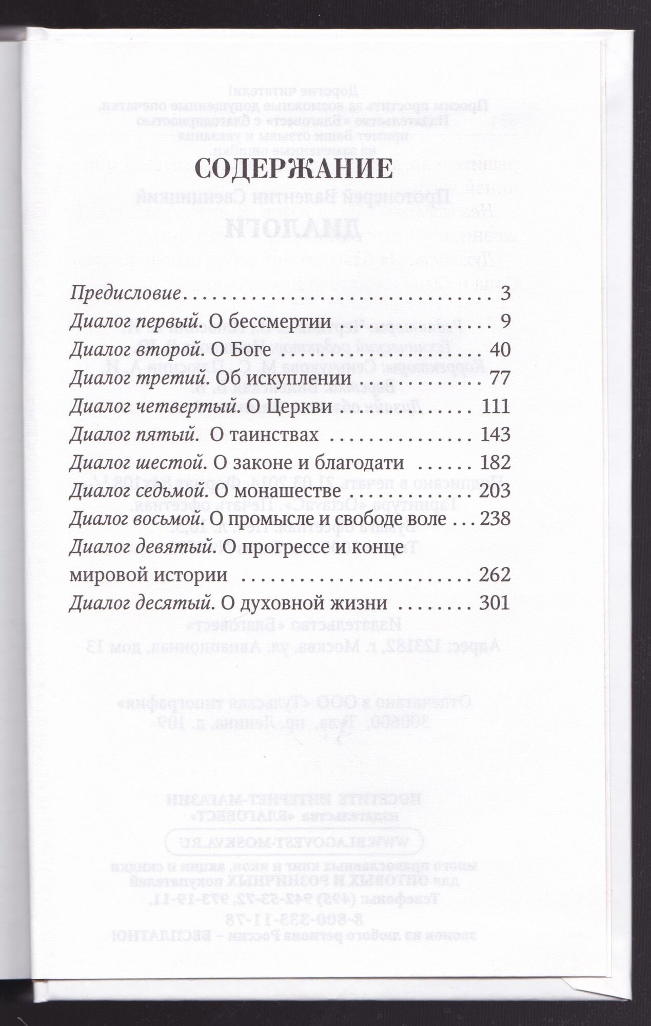 Книга замечательная, написано легко, современно, хотя ей почти сто лет. Удивило, что у людей век спустя, к религии и священникам все те же вопросы как и в книге у "неизвестного" к "духовнику". Написано очень живо, в какой то момент вжился и сам стал этим "неизвестным" собеседником задающим вопросы. Книга не в формате "Вопросы к священнику" и не "Блиц-опрос", Название "Диалоги" полностью оправдывает содержимое, книга разговаривает. Диванным атеистам и мамкиным богоборцам книга особо опасна.