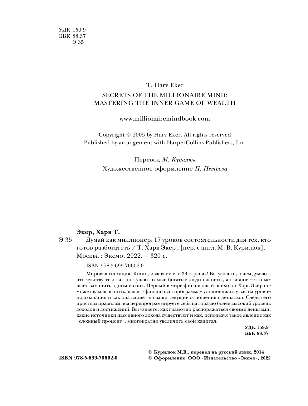 Думай как миллионер. 17 уроков состоятельности для тех кто готов разбогатеть (Т. Харв Экер); Эксмо, 2005