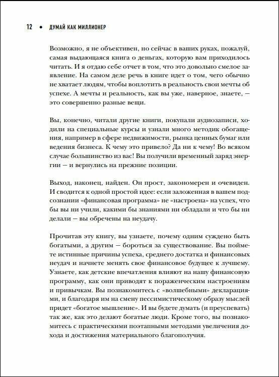 Книга написано просто и увлекательно. Но одно дело – понять, другое – перестроить мышление, которое с детства формировалось таким. Но сделать это нужно. Видел немало талантливых трудолюбивых людей, живущих от зарплаты до зарплаты. Почему? Да потому что все эти установки с детства, вяжут по рукам и ногам. Деньги просто проходят мимо, идут в карманы уверенных в себе людей, которые этих денег не боятся, более того, считают естественным, что они у них есть. Даже если половина книги будет усвоена, уже очень большой прогресс случится.
