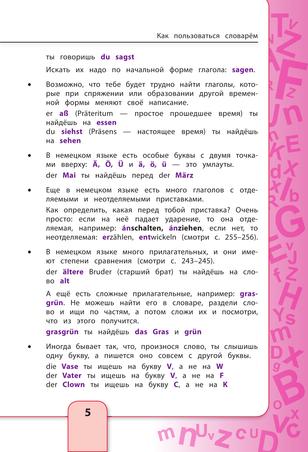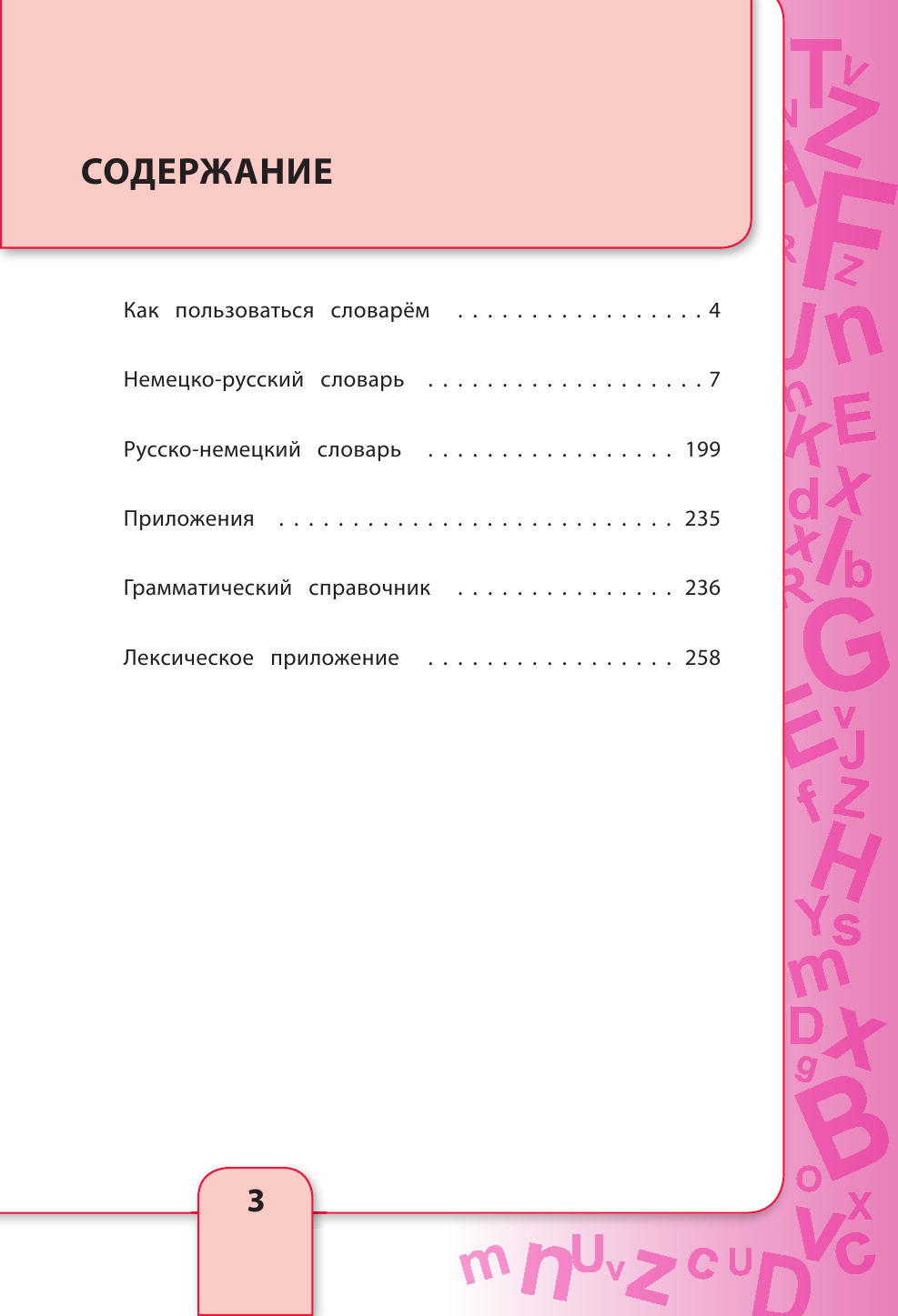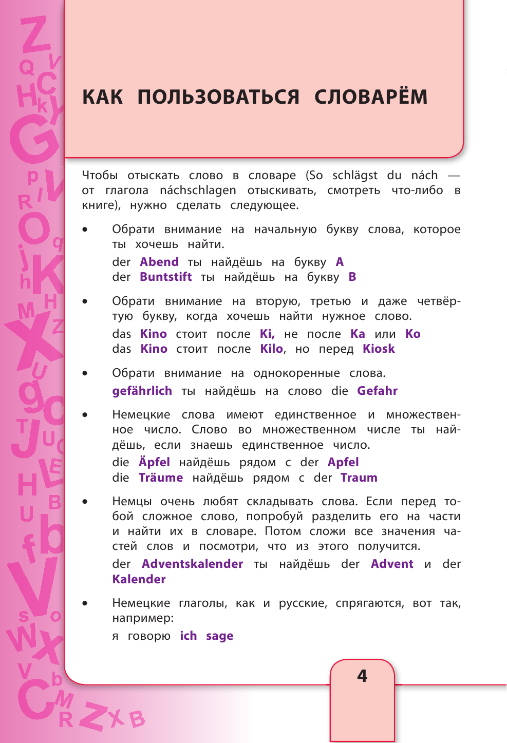 В словаре представлена базовая лексика немецкого языка, которая определена к изучению в начальной школе Федеральным государственным образовательным стандартом 2-го поколения. Лексика дана в алфавитном порядке. Употребление всех слов проиллюстрировано предложениями, доступными пониманию младших школьников. В словаре даны все необходимые учащимся формы слов: форма множественного числа существительных, все основные формы глаголов, формы степеней сравнения прилагательных. В словаре также даются необходимые грамматические правила и комментарии. Словарь снабжен красочными иллюстрациями, которые способствуют лучшему запоминанию слов. В конце словаря даны краткий грамматический справочник и иллюстрированное лексическое приложение.