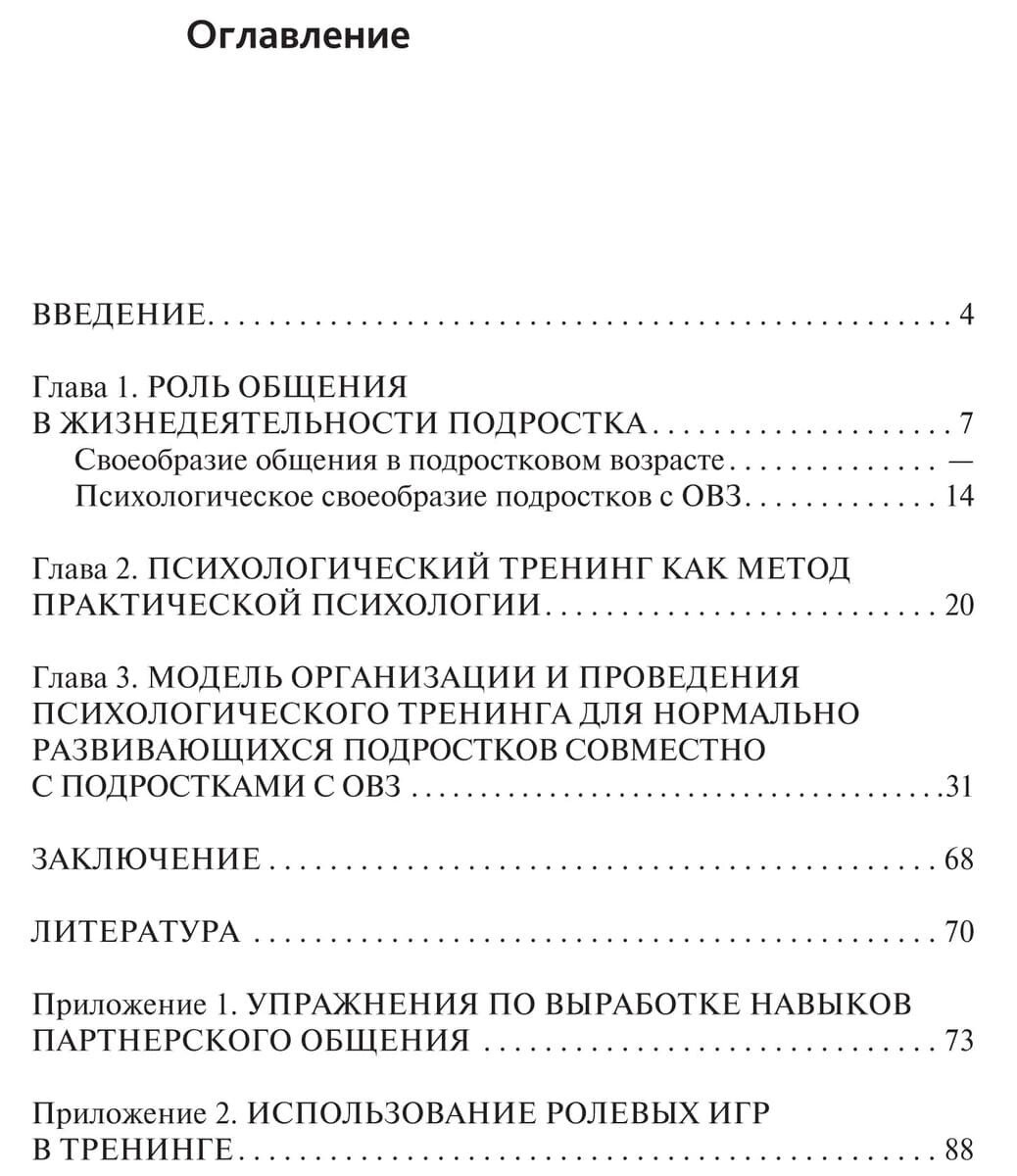 Ценность пособия состоит в подробном изложении специфики проведения психогимнастических техник, ролевых игр и арт-терапевтических упражнений при участии в тренинге как подростков с ОВЗ, так и их нормально развивающихся сверстников. Раскрыты возможности и особенности социальной перцепции подростков как с сенсорными нарушениями, так и с нарушениями опорно-двигательного аппарата.