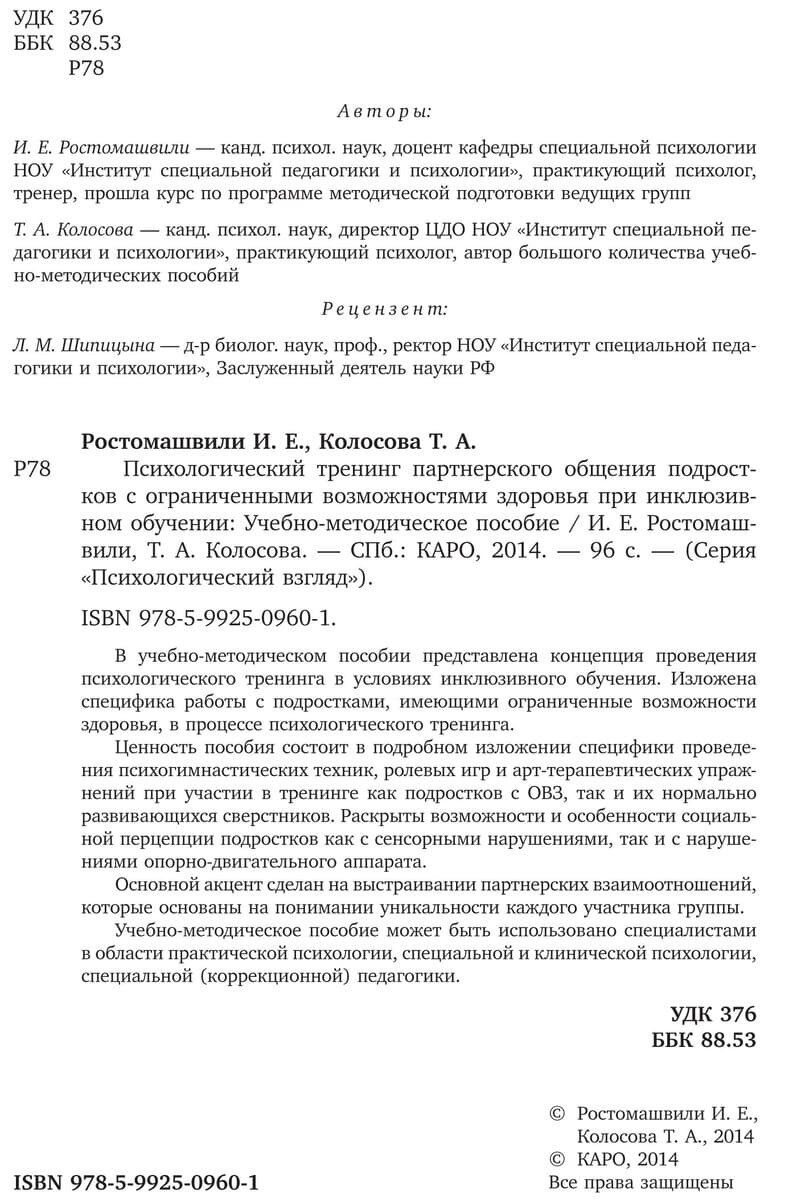 Психологический тренинг партнерского общения подростков с ограниченными возможностями здоровья (Ростомашвили И. Е., Колосова Татьяна Александровна); Каро, 2014