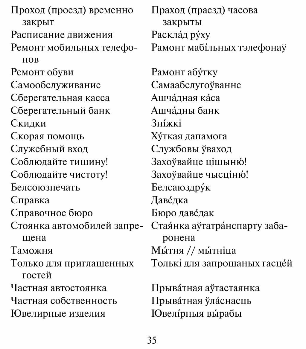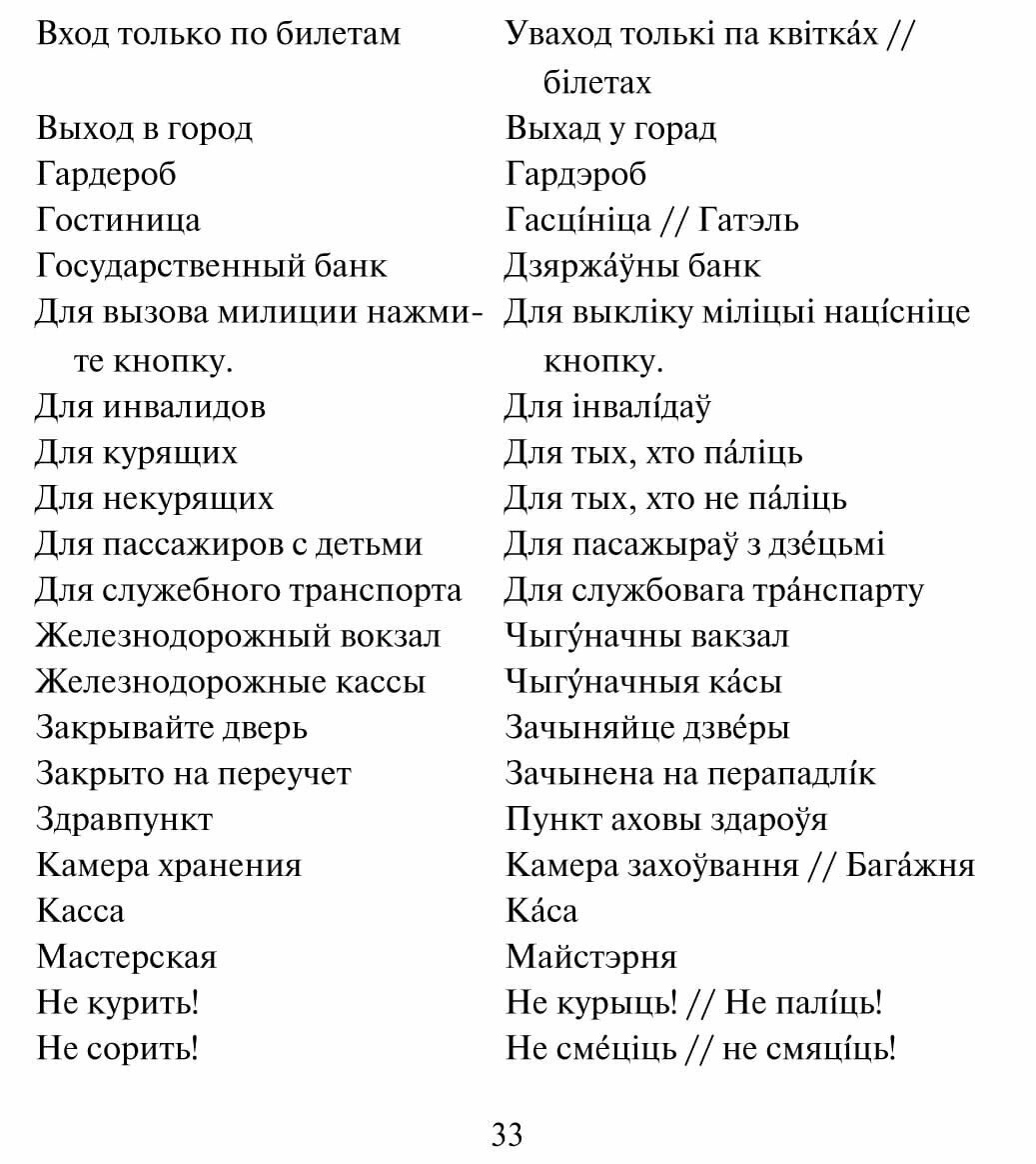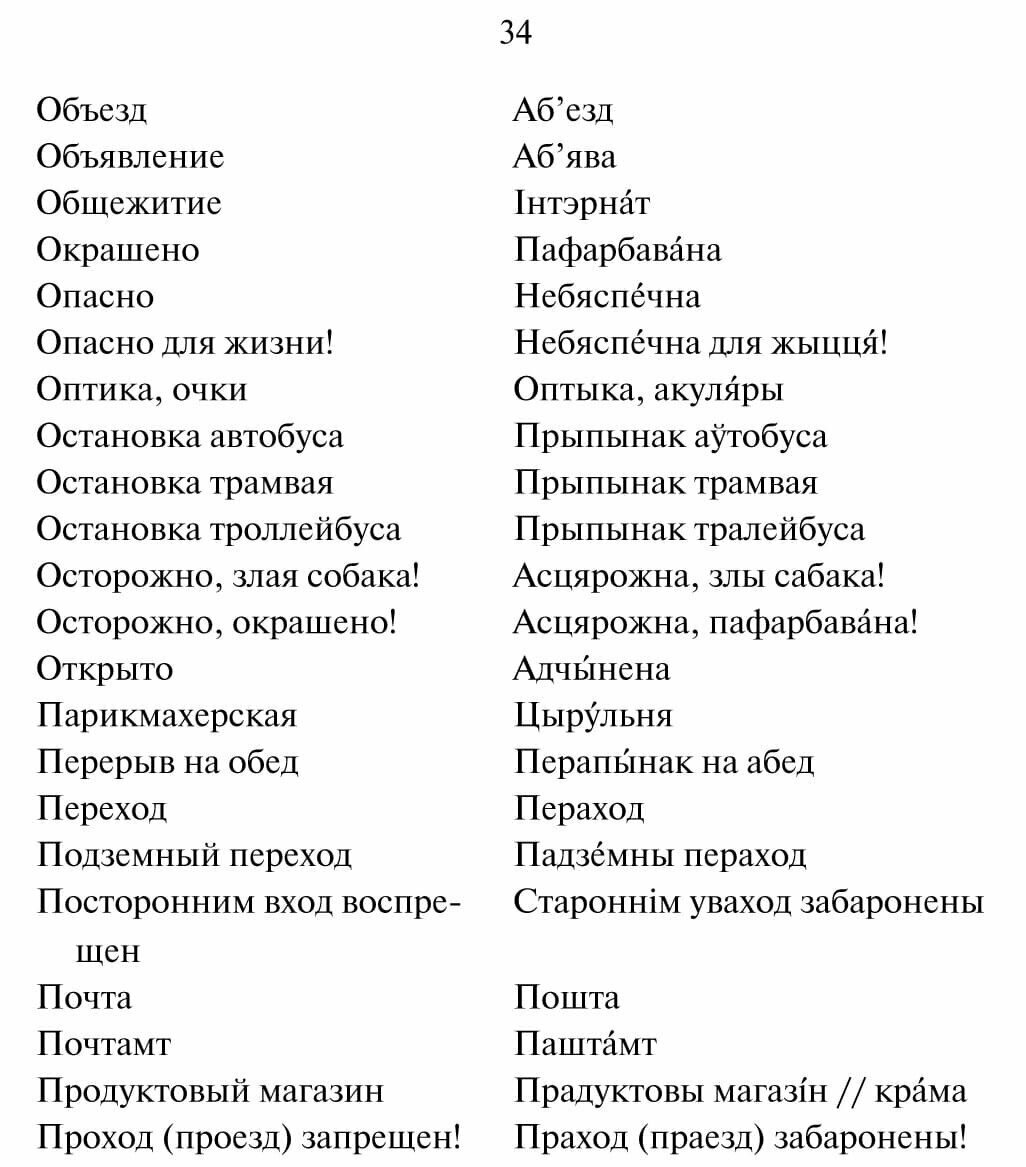 Такой близкий и похожий на наш белорусский язык часто кажется лёгким для понимания. Тем не менее, многие «знакомые» по звучанию слова могут указывать на совершенно другие по значению предметы. Чтобы не попасть в неловкую ситуацию, оказавшись в Белоруссии, предлагаем вашему вниманию карманный русско-белорусский разговорник. В нём вы найдете самые необходимые слова и речевые обороты с указанием ударений, справочную информацию о стране, её культуре и специфике.