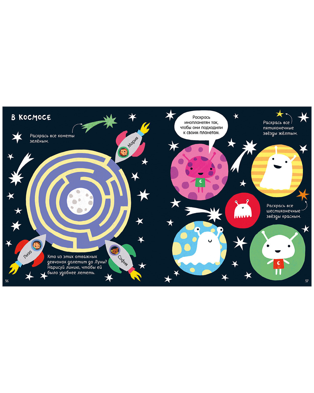 В этой книге собрано много, очень много замечательных заданий: как просто раскрасок (но непременно с условием, например, соблюдать цветовое единство или дорисовать определенную деталь), так и разнообразных наклеек, лабиринтов, заданий на писк лишних или одинаковых предметов, счет – просто масса всего. И все это очень красиво и аккуратно сделано: цвета нежные, но не один сплошной розовый, рисунки очень милые, наклейки легко отрываются и наклеиваются.