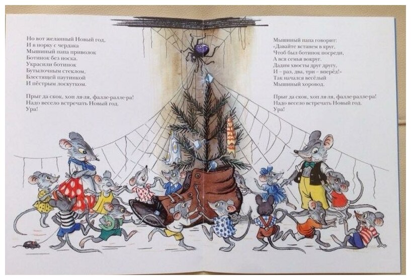 Добрая и весёлая сказка легко читается и быстро запоминается. А еще она необыкновенно хорошо иллюстрирована гениальным художником Владимиром Сутеевым. Мышиное жилище и семейные отношения нарисованы с великой любовью к деталям: генеральная предпраздничная уборка, скакалки, бантики, мышки-игрушки на верёвочке, ссора из-за кусочка колбаски, развешанные после стирки штанишки, платьица и маечки многочисленной мышиной детворы, ночной горшочек из ореховой скорлупы, заботливые мыши-родители и мудрая мышь-бабушка, сидящая на качалке-картофелине, и много-много других милых подробностей мышиного быта.