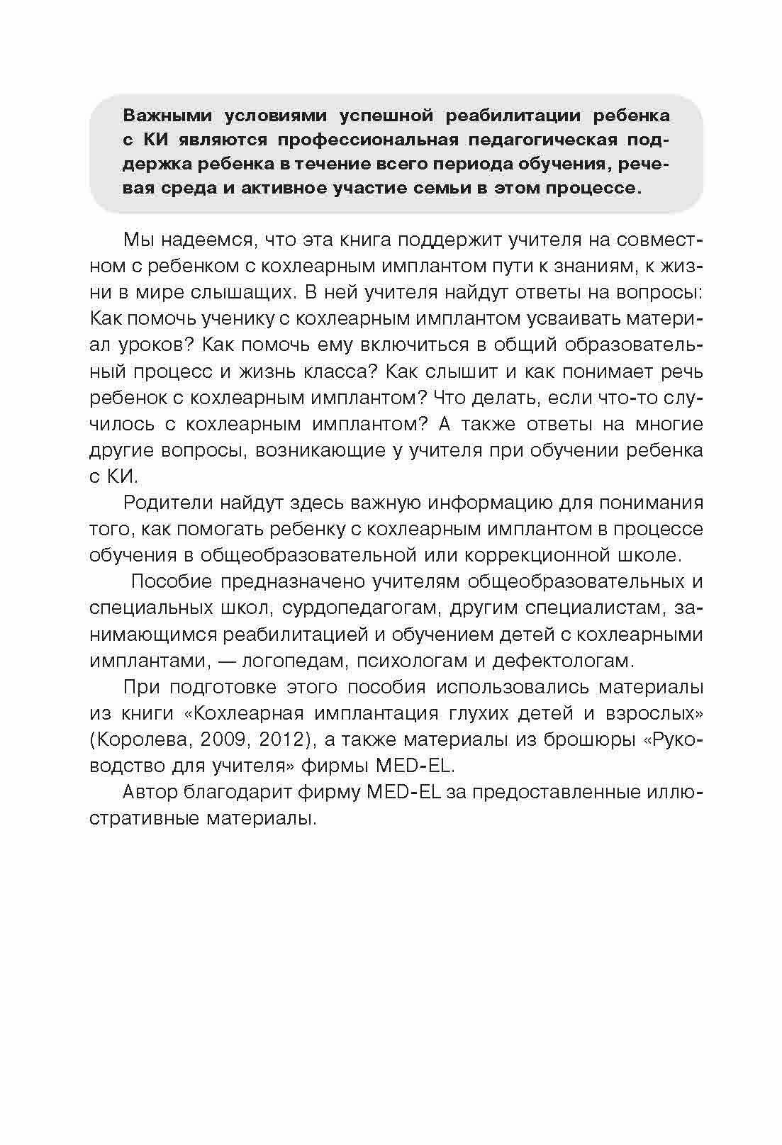 Пособие предназначено для учителей общеобразовательных и коррекционных школ, сурдопедагогов, а также других специалистов, занимающихся реабилитацией и обучением детей с кохлеарными имплантами, - логопедов, дефектологов, психологов. Важную информацию найдут в нем родители детей с кохлеарными имплантами. Кроме того, советы, содержащиеся в пособии, будут полезны родителям, дети которых используют слуховые аппараты.