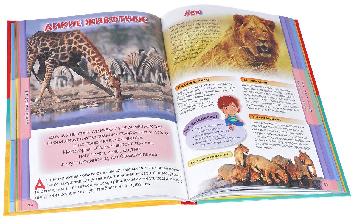 Очень хорошая книжка. В первую очередь она мне понравилась своим оформлением. Обложка привлекает внимание: такая яркая и детская. Потом внутри очень много иллюстраций, при том, что очень много именно фотографий. А все разделы выделены в книги своим цветом в книге: странички сбоку прокрашены, да и там же присутствует название раздела. Очень удобно искать нужный раздел. Плюс перед каждым разделом есть свое введение: разворот с изображением по теме плюс небольшой текст-введение. Оформлено всё очень прикольно, видно что дизайнеры и художники хорошо потрудились.