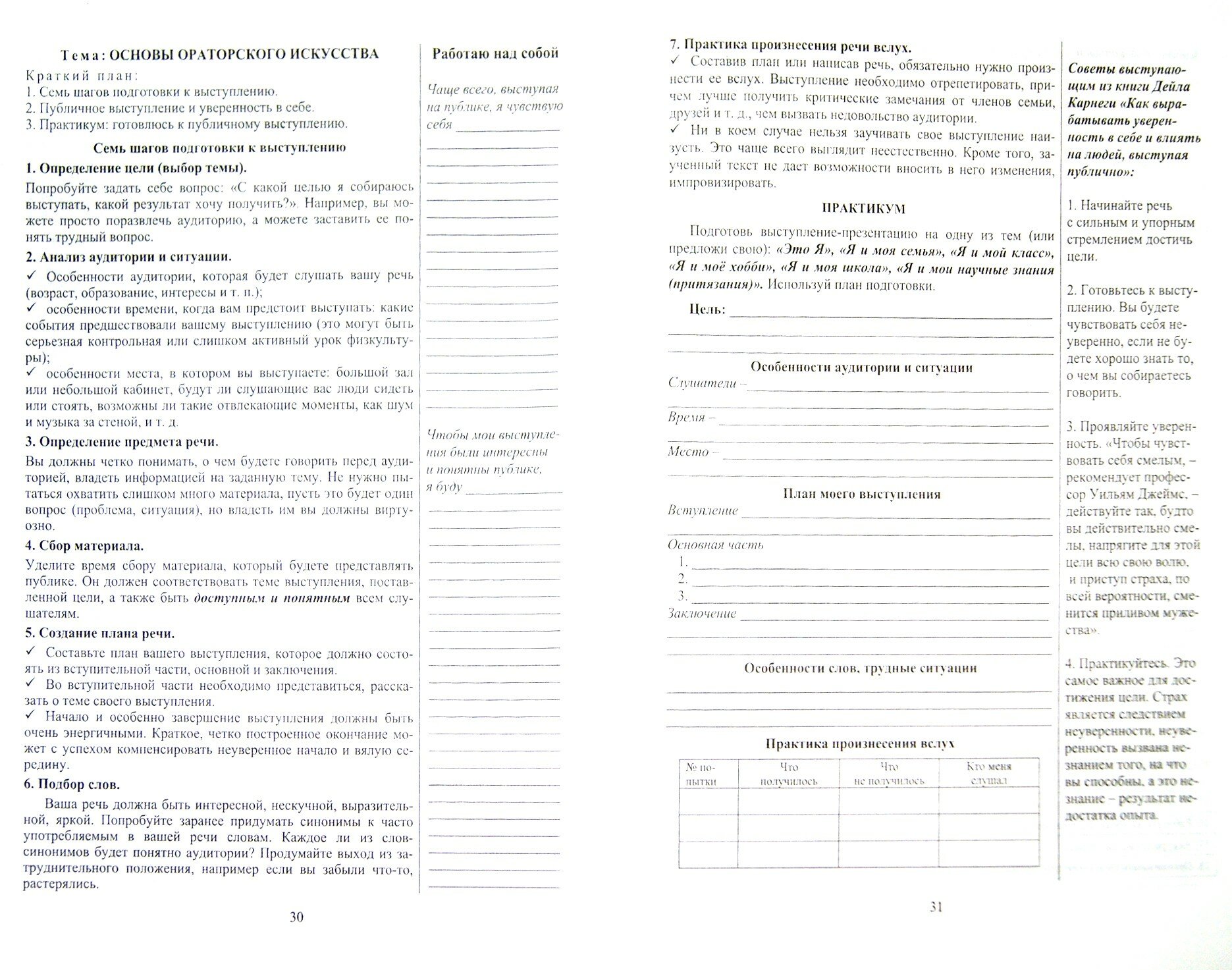 Каждую тему предваряет эпиграф и краткий план. Часто в основе работы лежит отрывок из художественного произведения. Темы предлагается обдумать, ответив на вопросы. Есть рубрика "Работаю над собой", где ребёнок может проанализировать свои действия в предложенных ситуациях.
