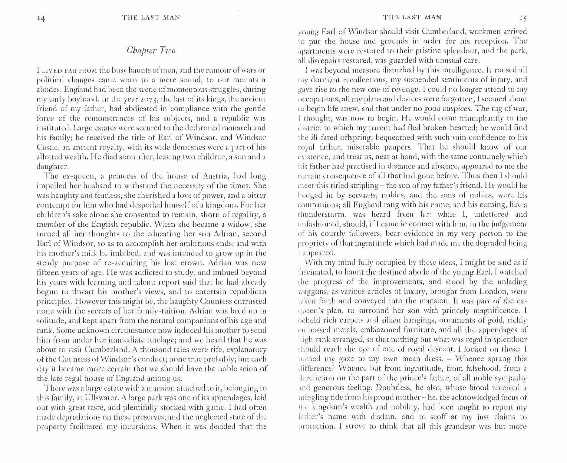 The Last Man is Man' Shelley's apocalyptic fantasy of the end of human civilization. Set in the late twenty-first century, the novel inevitable destruction. Interwoven with her futuristic theme, Mary Shelley incorporates idealised portraits of Shelley and Byron, yet rejects Romanticism and its faith in art and nature.