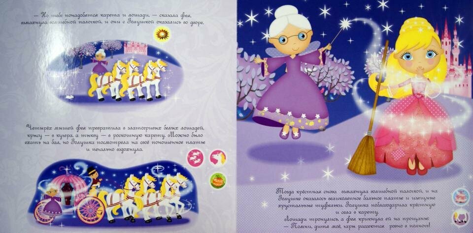несмотря на мою любовь к красивым иллюстрациям, заказала из этой серии красную шапочку, и теперь она с нами по три четыре раза в день. и дабы разнообразить досуг, заказала и эту. текст доступный, но лучше потом перечитать оригинал, все же здесь все крайне кратко. а идея с большим количеством кнопок-гениальна. у нас все работает. дочке 2 года, смотрим с 1,5. увидев эту прыгала от радости.