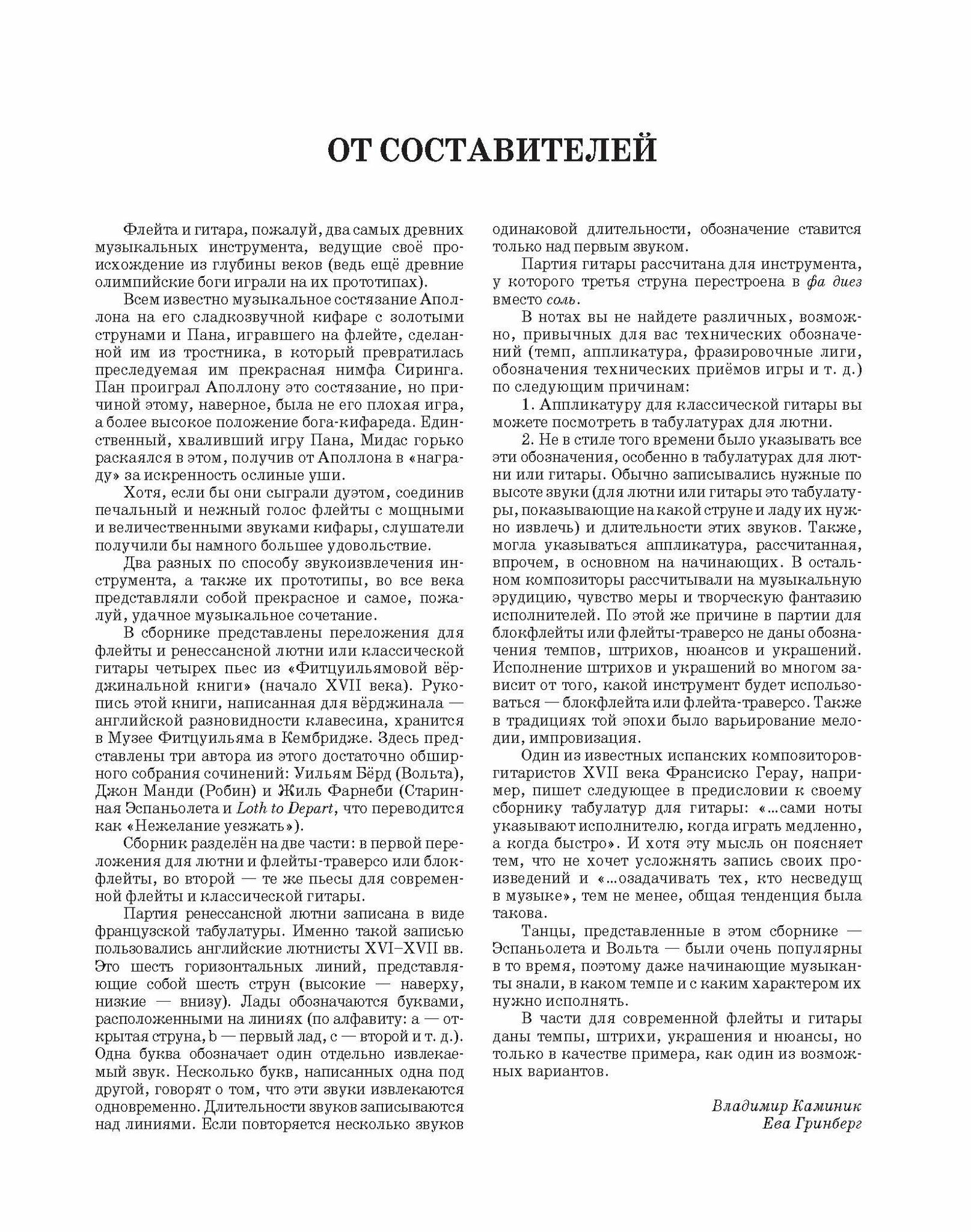 В сборнике представлены переложения для флейты и ренессансной лютни или классической гитары четырех пьес из "Фитцуильямовой вёрджинальной книги" (начало XVII века). Сборник разделен на две части: в первой переложения для лютни и флейты-траверсо или блокфлейты, во второй те же пьесы для современной флейты и классической гитары. Сборник предназначен для учащихся и педагогов музыкальных школ, а также для всех любителей музыки.