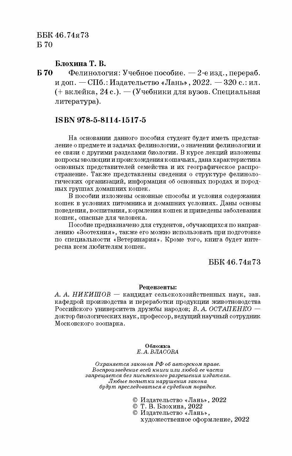 Фелинология. Учебное пособие (Т. В. Блохина); Издательство ЛАНЬ, 2014