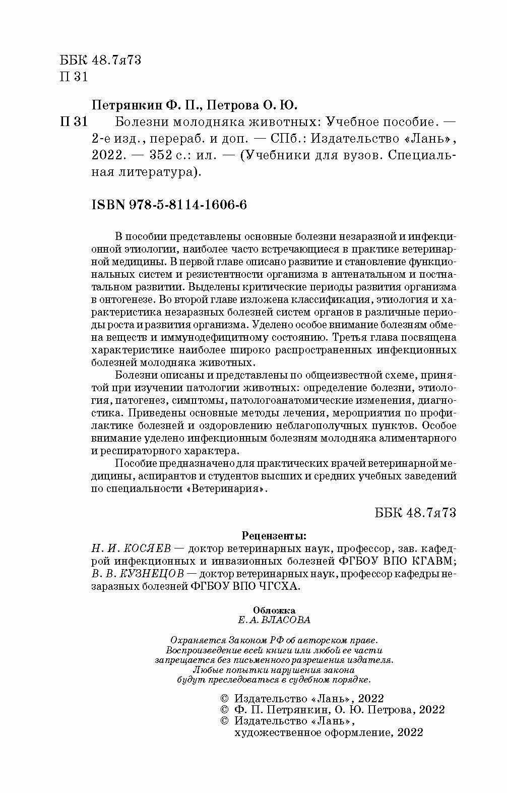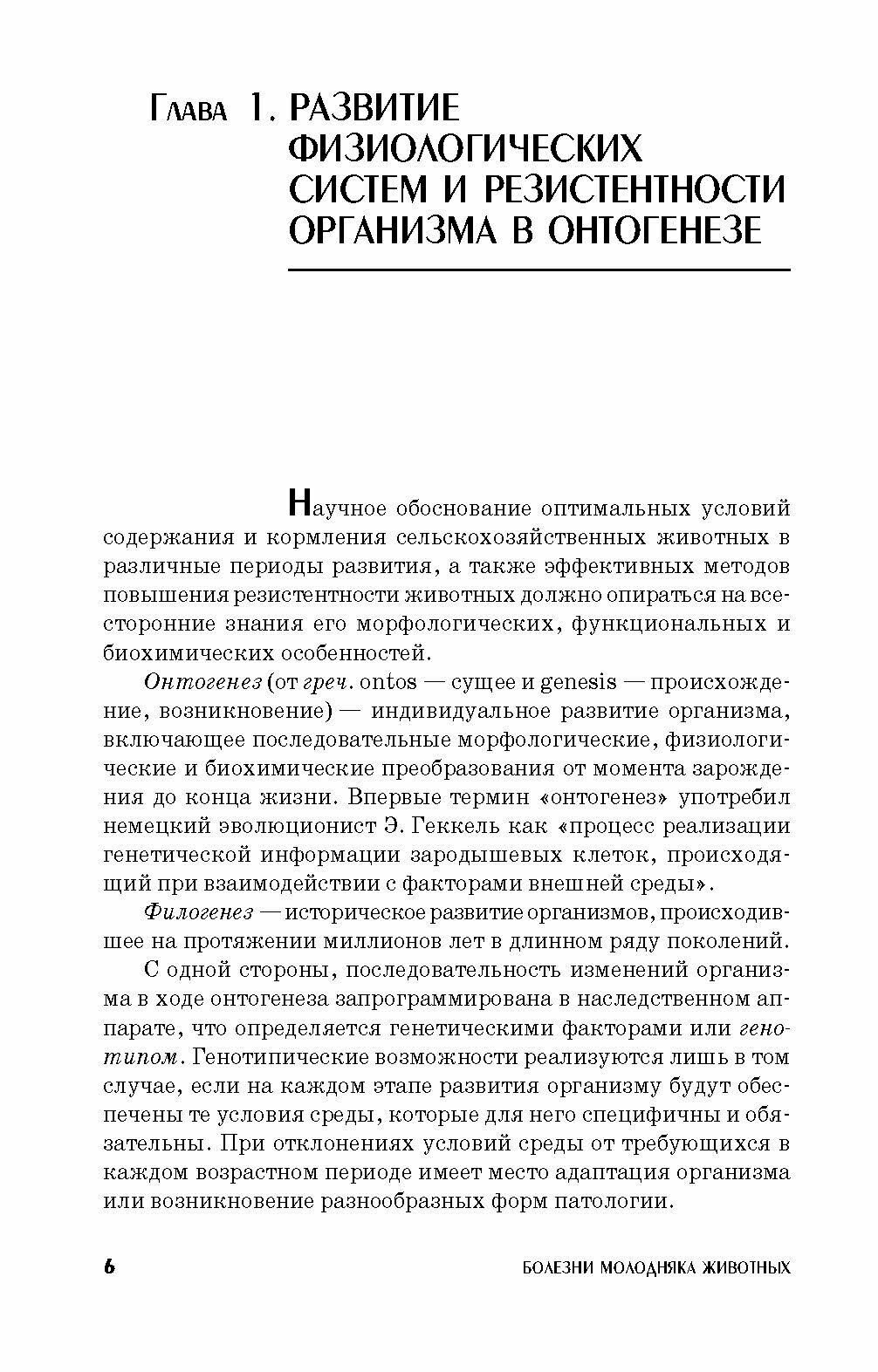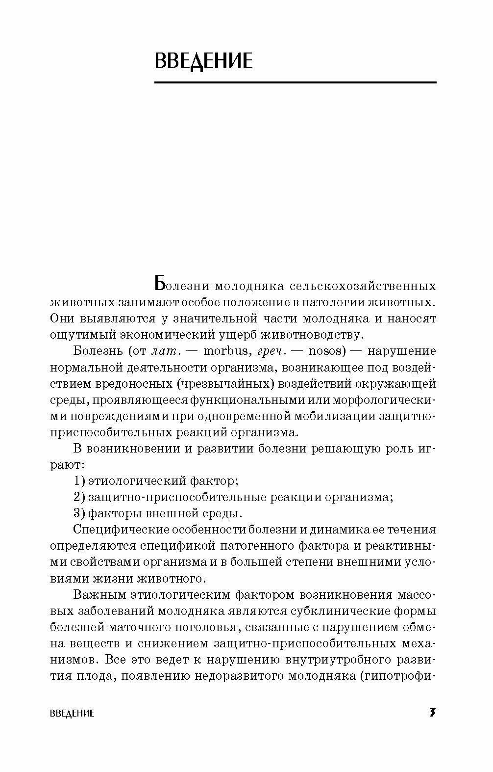 В пособии представлены основные болезни незаразной и инфекционной этиологии, наиболее часто встречающиеся в практике ветеринарной медицины. В первой главе описано развитие и становление функциональных систем и резистентности организма в антенатальном и постнатальном развитии. Выделены критические периоды развития организма в онтогенезе. Во второй главе изложена классификация, этиология и характеристика незаразных болезней систем органов в различные периоды роста и развития организма. Уделено особое внимание болезням обмена веществ и иммунодефицитному состоянию. Третья глава посвящена характеристике наиболее широко распространенных инфекционных болезней молодняка животных. Болезни описаны и представлены по общеизвестной схеме, принятой при изучении патологии животных: определение болезни, этиология, патогенез, симптомы, патологоанатомические изменения, диагностика. Приведены основные методы лечения, мероприятия по профилактике болезней и оздоровлению неблагополучных пунктов. Особое внимание уделено инфекционным болезням молодняка алиментарного и респираторного характера. Пособие предназначено для практических врачей ветеринарной медицины, аспирантов и студентов высших и средних учебных заведений, обучающихся по специальности "Ветеринария".