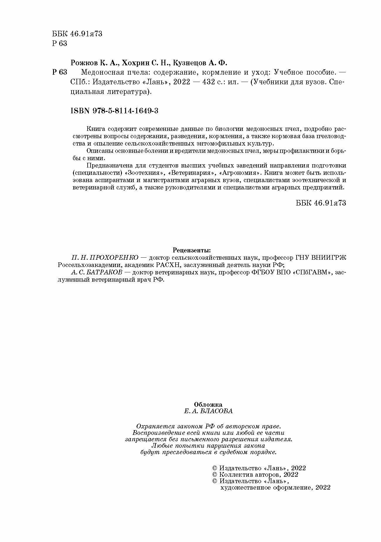 Медоносная пчела. Содержание кормление и уход. Учебное пособие (Рожков Константин Александрович, Хохрин Савва Николаевич, Кузнецов Анатолий Федорович); Лань, 2014