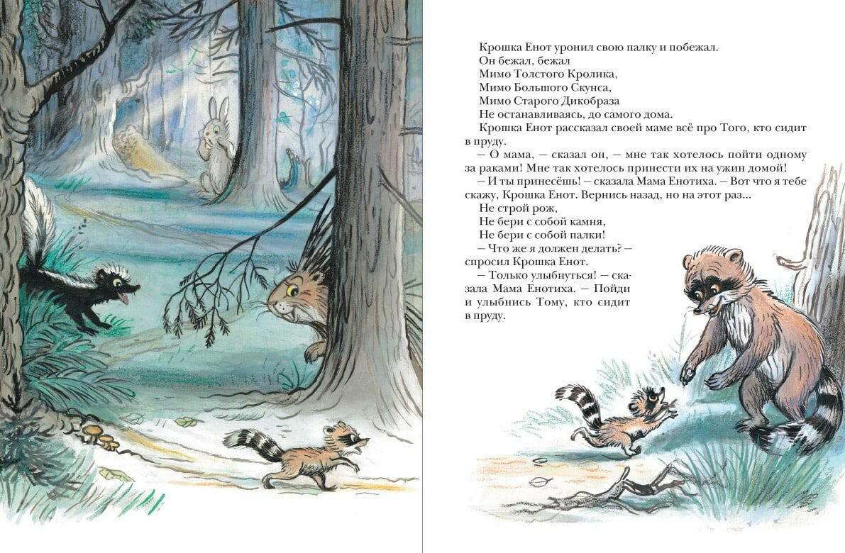 Можно без преувеличения сказать – всё детство дедушек и бабушек, родителей, а теперь детей и внуков разрисовано гениальным левшой Владимиром Григорьевичем Сутеевым. Одна из самых добрых его книг – это история про маленького, но храброго Крошку Енота, который сначала ужасно боялся, а потом подружился с Тем, кто сидел в пруду. Сказку написала американская писательница Лилиан Муур, а Владимир Сутеев дал книге вторую, яркую и, по сути, бессмертную жизнь.