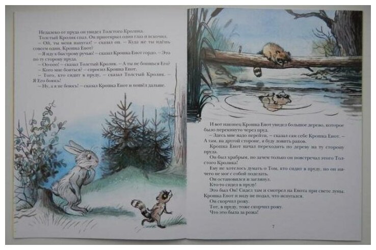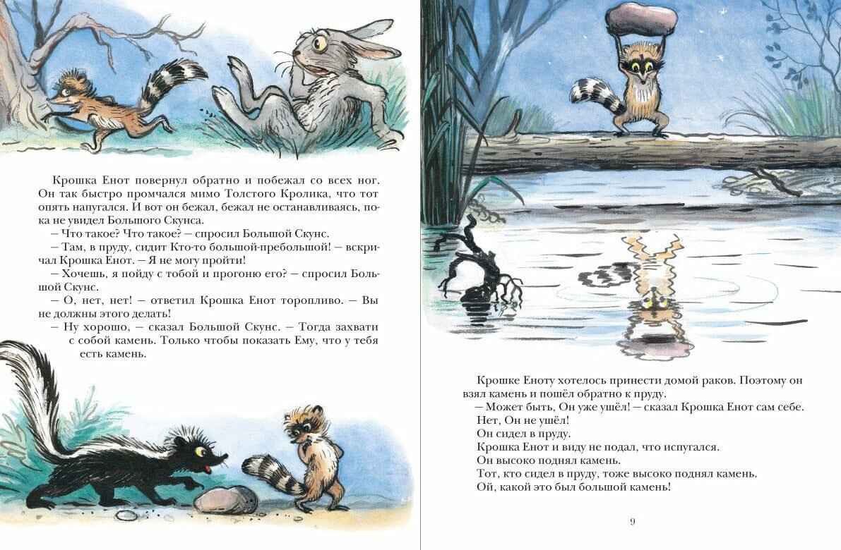 Мама дает сыну мудрый совет: не грозить и не замахиваться на Того, кто сидит в пруду, а просто улыбнуться ему. Енотик так и поступает. На этот раз Тот, кто сидит в пруду улыбается ему в ответ. Наловив раков, малыш возвращается домой, а мама открывает ему секрет – кто же всё-таки на самом деле сидел в пруду. Но догадаться о том, кто этот такой, маленькому читателю предстоит самому с помощью родителей. Главный и очень важный для малыша вывод – Крошка енот был маленьким, но храбрым, а быть храбрым – очень хорошо.